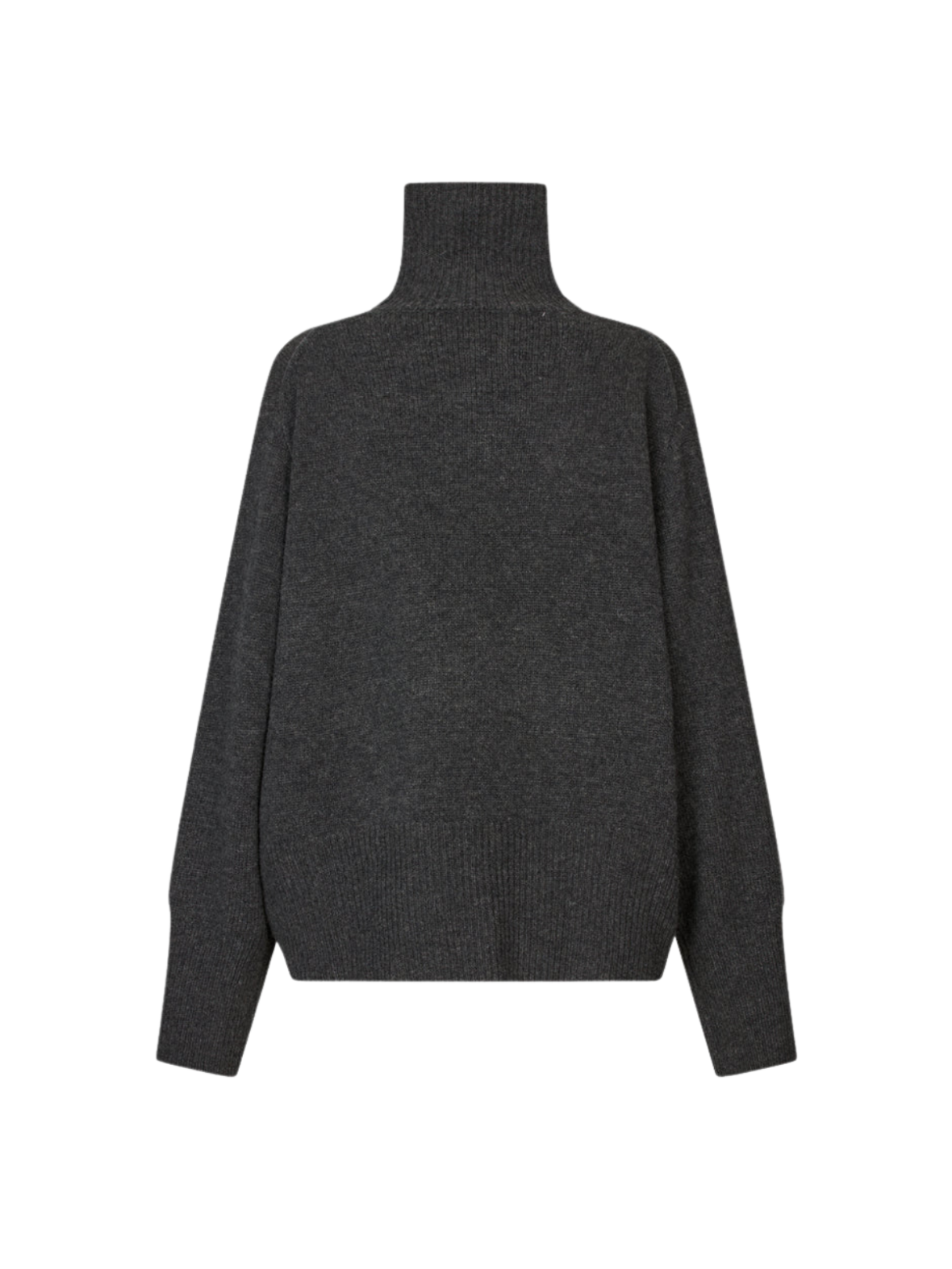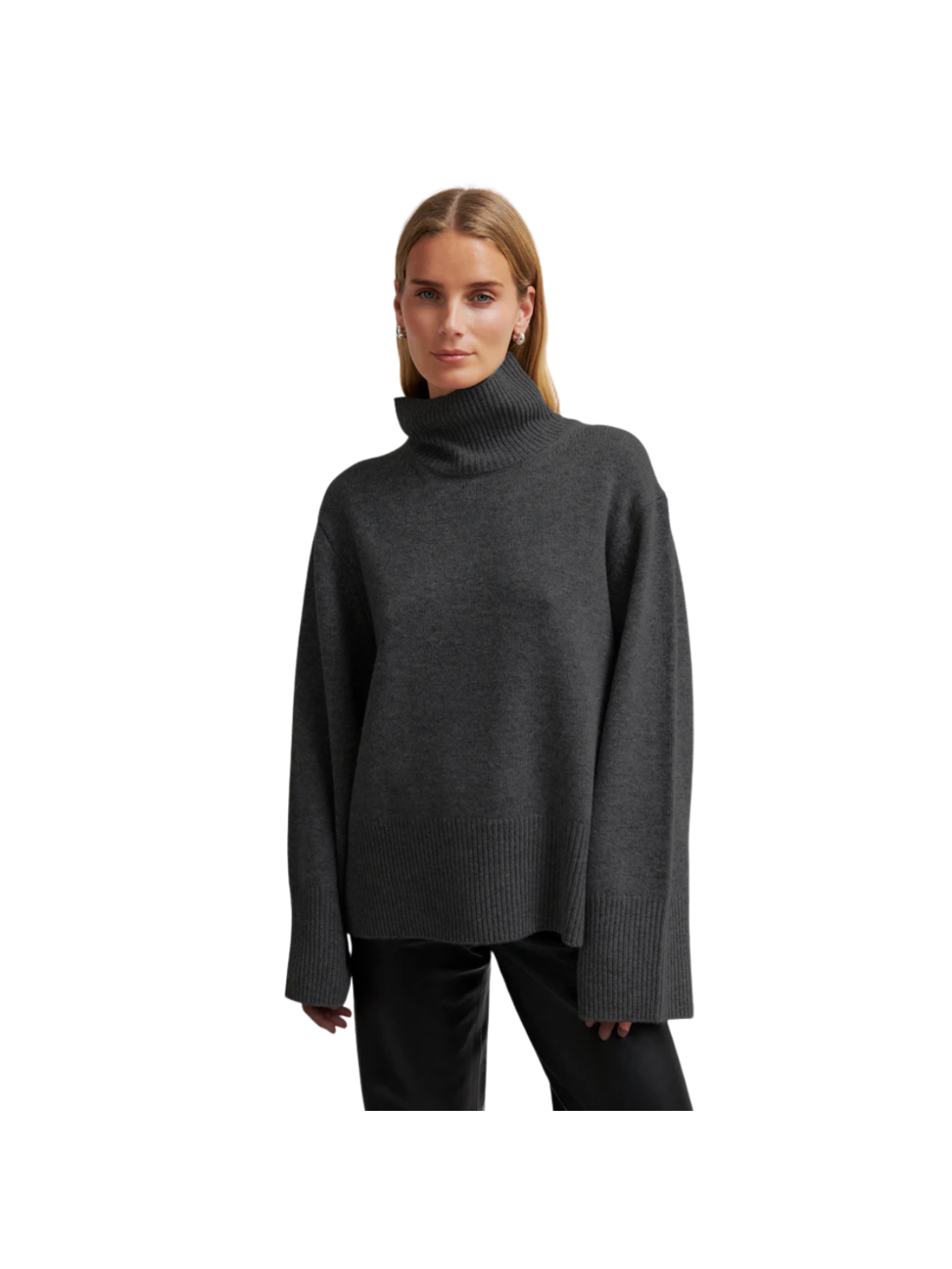 enne mørkegrå rullekravestrik er en tidløs klassiker, der kombinerer varme og elegant minimalisme. Den har en løs, boxy pasform og en høj, blød hals, som giver et sofistikeret look og ekstra komfort på kolde dage. Ribkanter ved ærmer og bund giver trøjen struktur