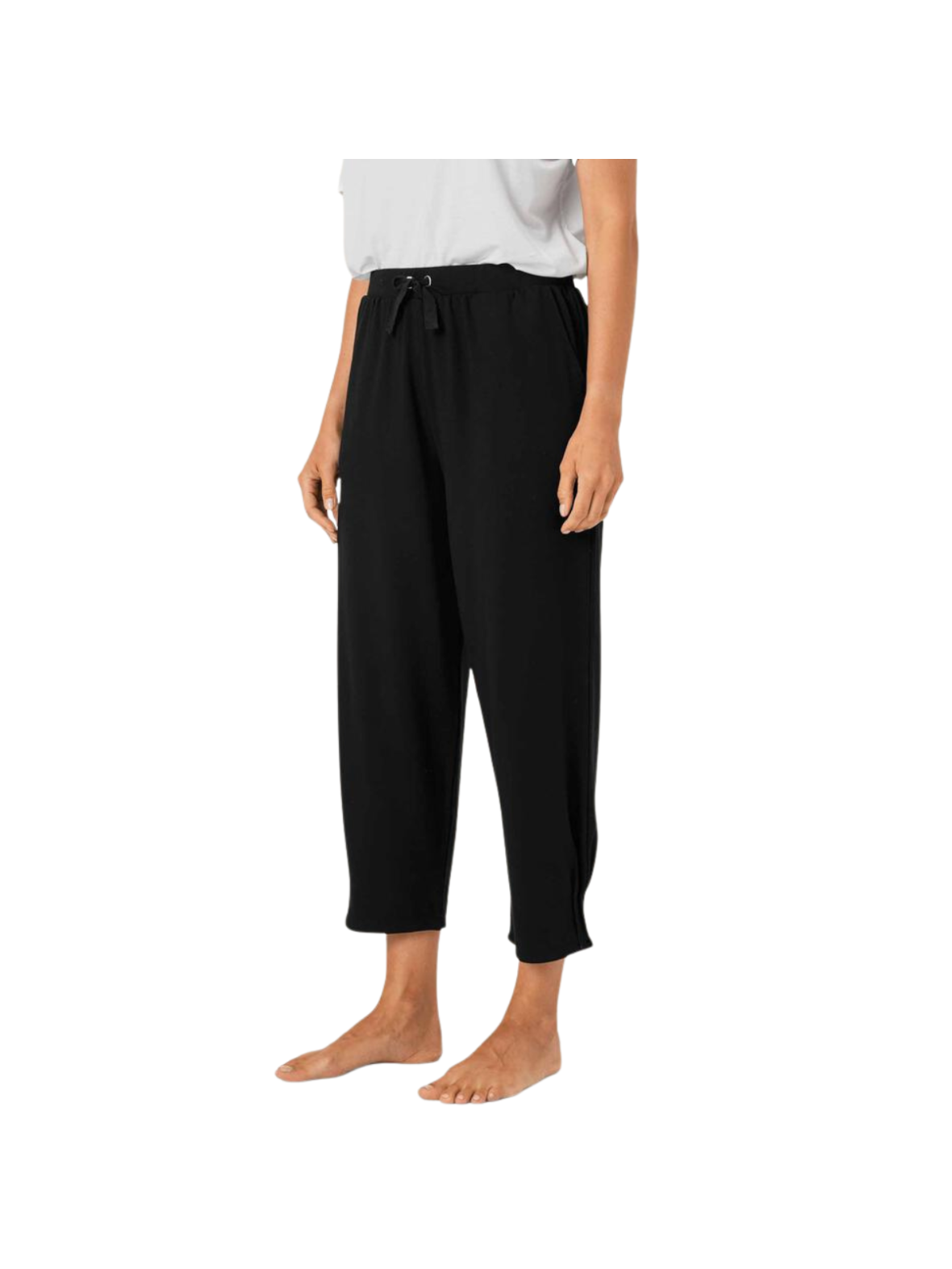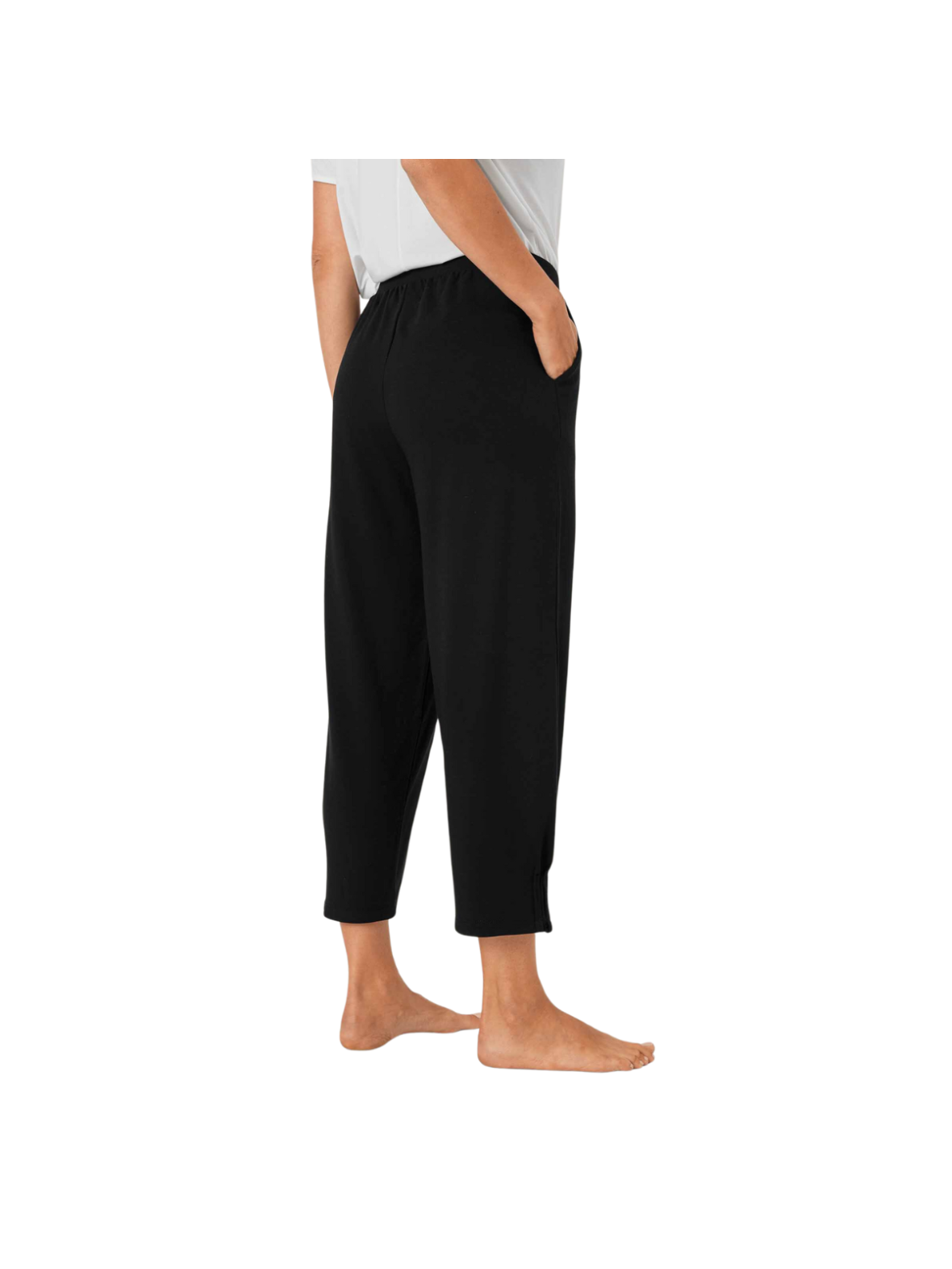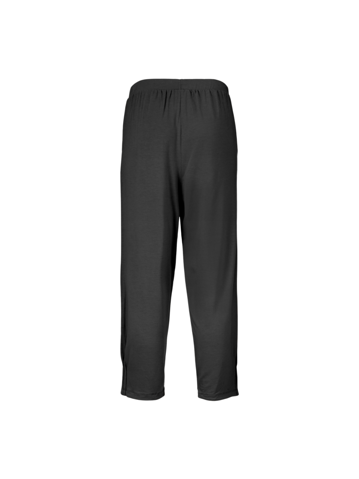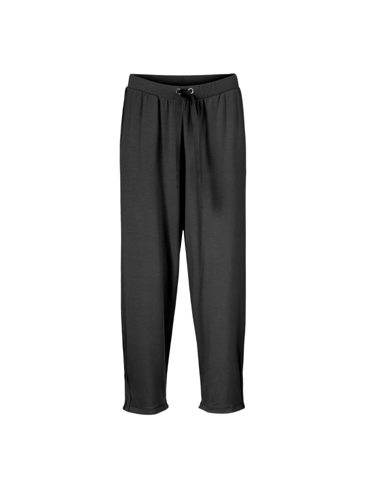 Disse sorte bukser er lavet i et blødt og behageligt materiale, der giver dem et afslappet og luksuriøst lounge-udtryk. Den elastiske talje med bindebånd sikrer en perfekt og komfortabel pasform, mens det lige ben skaber et elegant fald. Perfekte til afslappede dage, hjemmearbejde eller et casual hverdagslook.