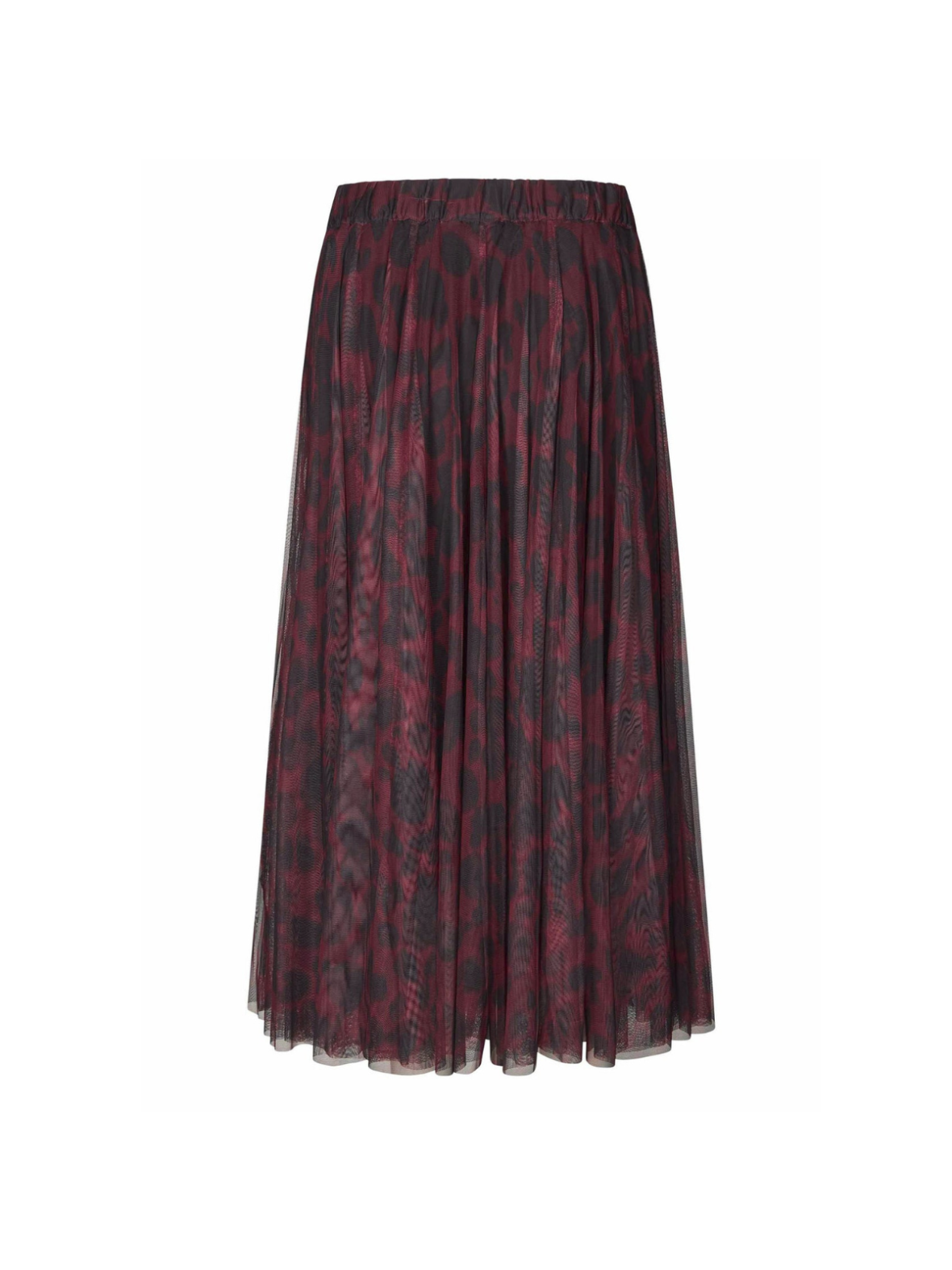 Denne midi-nederdel kombinerer et elegant fald med et moderne leopardmønster i dybe bordeaux og sorte nuancer. Det lette, plisserede mesh skaber smuk bevægelse og giver nederdelen et feminint og luftigt udtryk. Den elastiske talje gør den komfortabel og alsidig til både hverdag og fest.