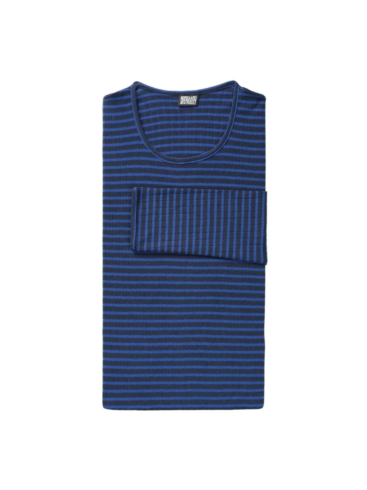 Denne blåstribede top har et klassisk, tidløst udtryk med fine, smalle striber i mørkeblå og koboltblå. Den er lavet i en blød, strækbar kvalitet, der gør den perfekt til hverdagsbrug. Style den med jeans og en cardigan for et afslappet look, eller brug den under en blazer for en mere poleret stil.