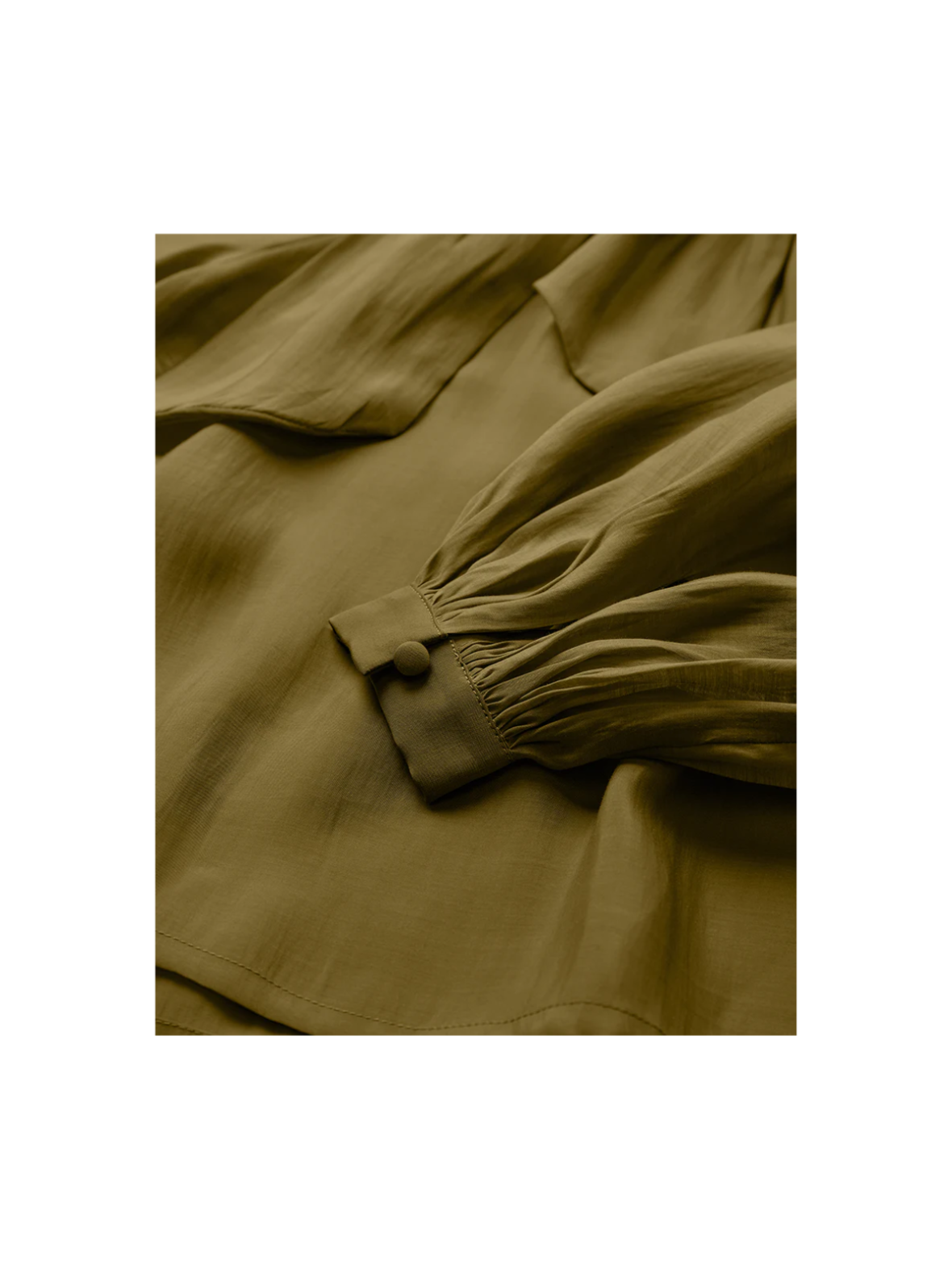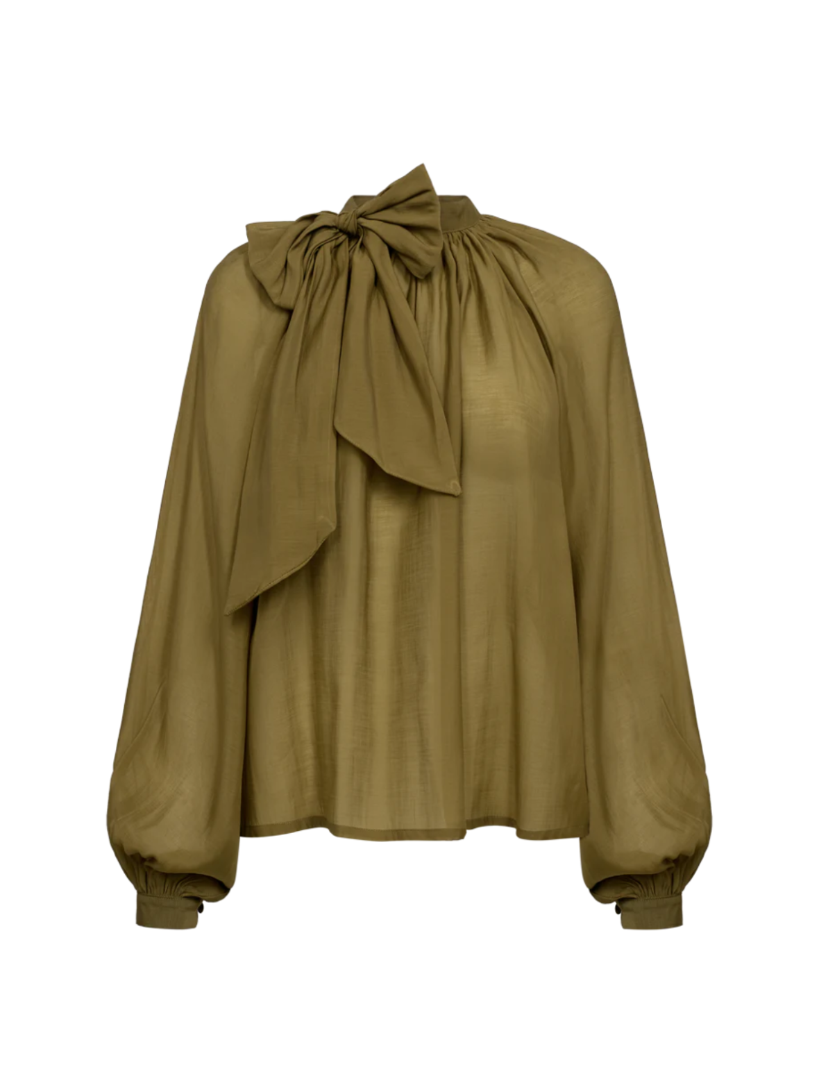 Denne bluse har et elegant og feminint udtryk med fine detaljer, der giver et sofistikeret look. Den er designet med en høj hals og en smuk sløjfedetalje, som kan bindes foran og skaber et blødt fald. De lange ærmer har let volumen og afsluttes med manchetter, hvilket giver blusen et raffineret og moderne præg. Stoffet er let og let transparent, hvilket gør den behagelig at have på og nem at style.