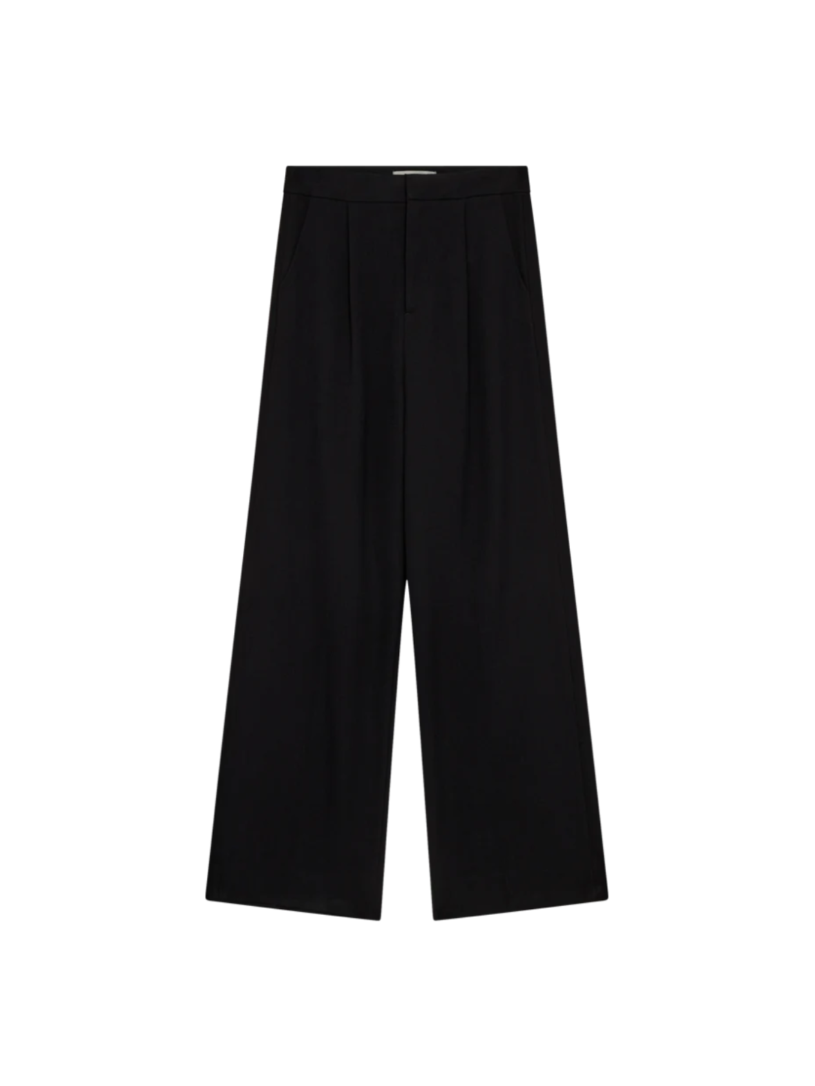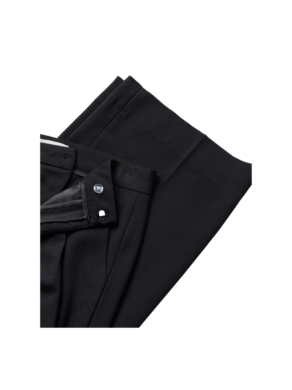 Disse bukser har et klassisk og elegant snit med et tidløst udtryk. De er designet i en lige, let vid pasform, som giver et flot fald og en behagelig silhuet. Taljen er enkel og velafsluttet, og bagpå har bukserne diskrete paspolerede lommer, der understreger det rene og skræddersyede look.