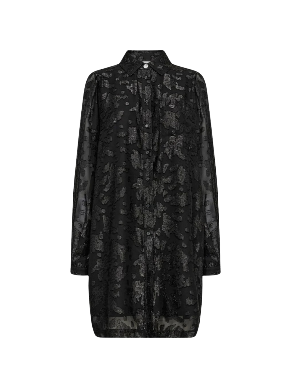 Elegant og let skjorte i sort med et diskret, struktureret mønster, der giver et eksklusivt og sofistikeret udtryk. Den er designet i et let transparent materiale, som skaber et feminint look med dybde og spil. Skjorten har klassisk krave, gennemgående knaplukning og lange ærmer med let volumen, der giver en flot silhuet. Pasformen er afslappet og en smule længere, hvilket gør den ideel både som skjorte og som en let skjortekjole. Perfekt til både hverdagsbrug med jeans og til mere elegante anledninger stylet med bukser eller nederdel.