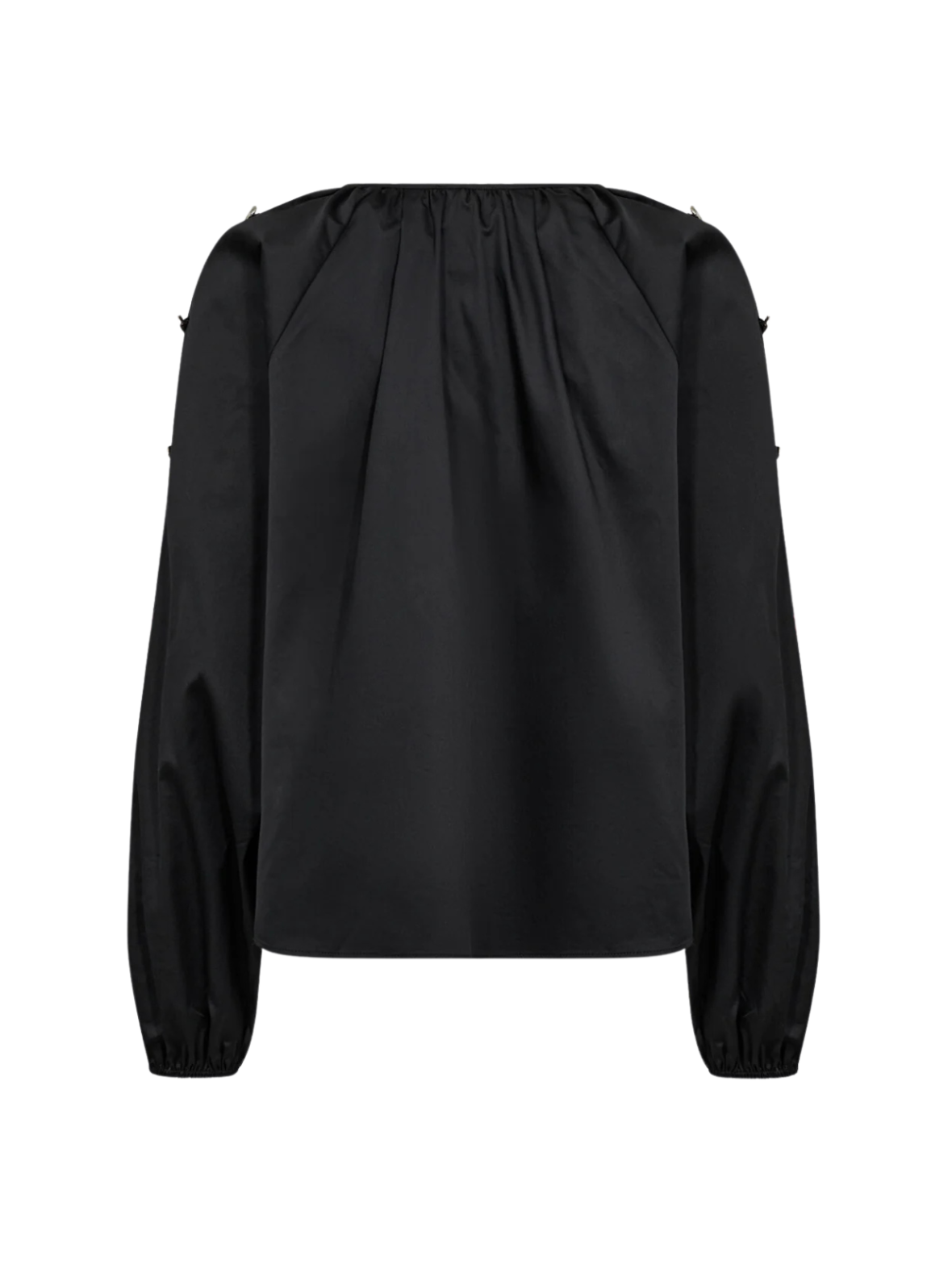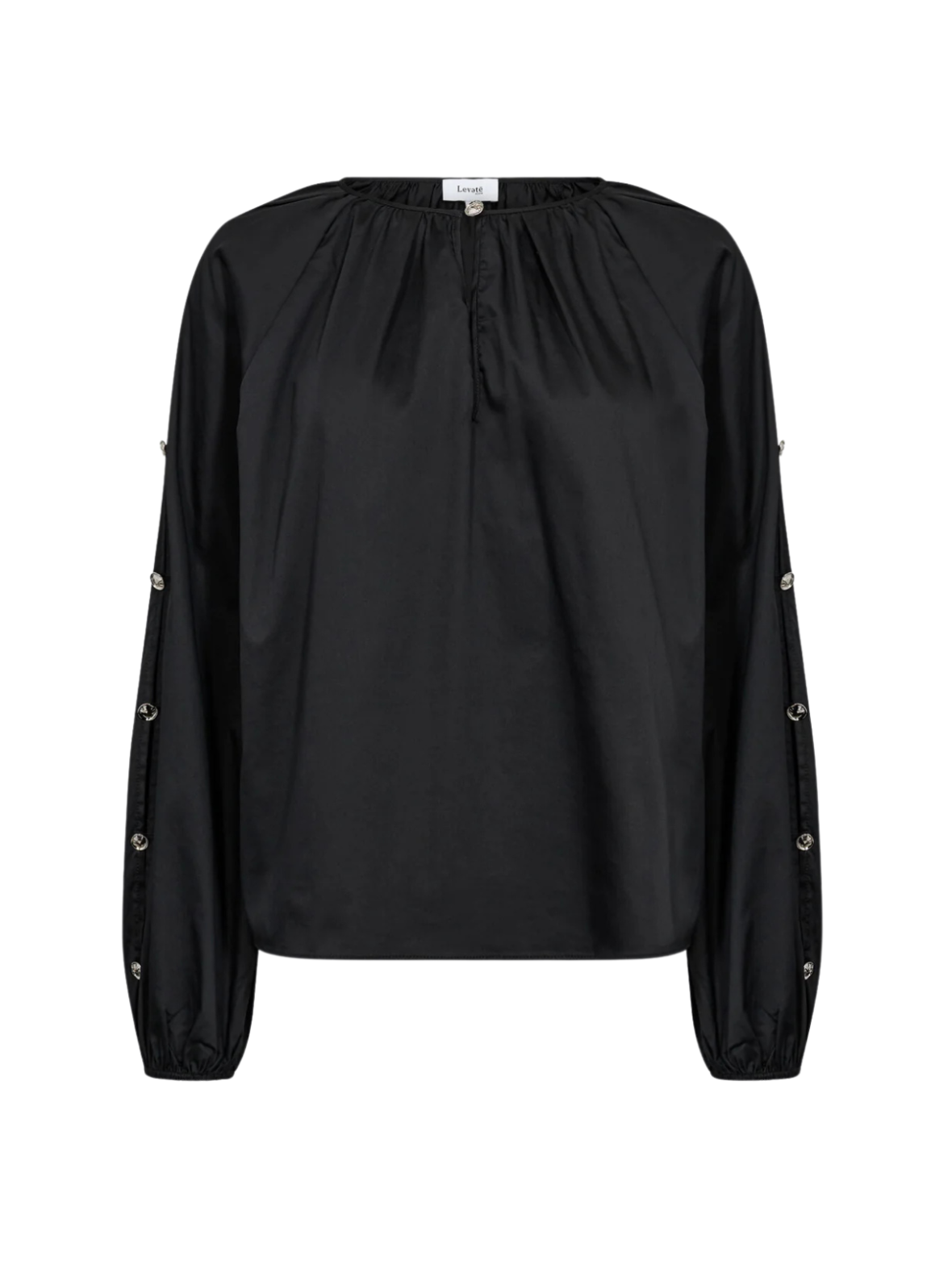 Denne sorte bluse har et elegant og feminint udtryk med fine detaljer, der løfter det enkle design. Den er designet med rund hals og let rynkning ved halsudskæringen, som giver et blødt fald. De lange ærmer er afsluttet med små dekorative knapper langs siden, der tilfører et eksklusivt og moderne touch. Blusen har en løs og behagelig pasform, som gør den nem at style både til hverdag og mere formelle anledninger. Brug den med klassiske bukser, nederdel eller jeans for et stilrent og alsidigt look.