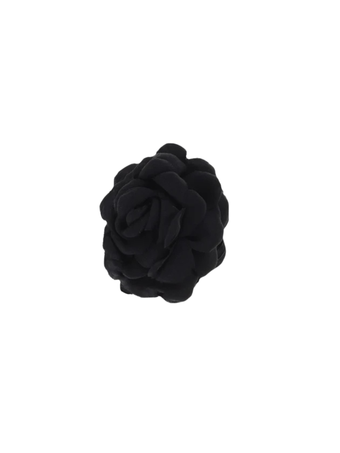Denne stofblomst har et klassisk og elegant udtryk i dyb sort. De bløde, lagdelte kronblade giver blomsten en smuk roselignende form og et eksklusivt look. Den tidløse farve gør den nem at style og perfekt som detalje på en blazer, kjole, taske eller i håret. Et enkelt og stilfuldt accessory, der tilfører et sofistikeret touch til både hverdag og fest.