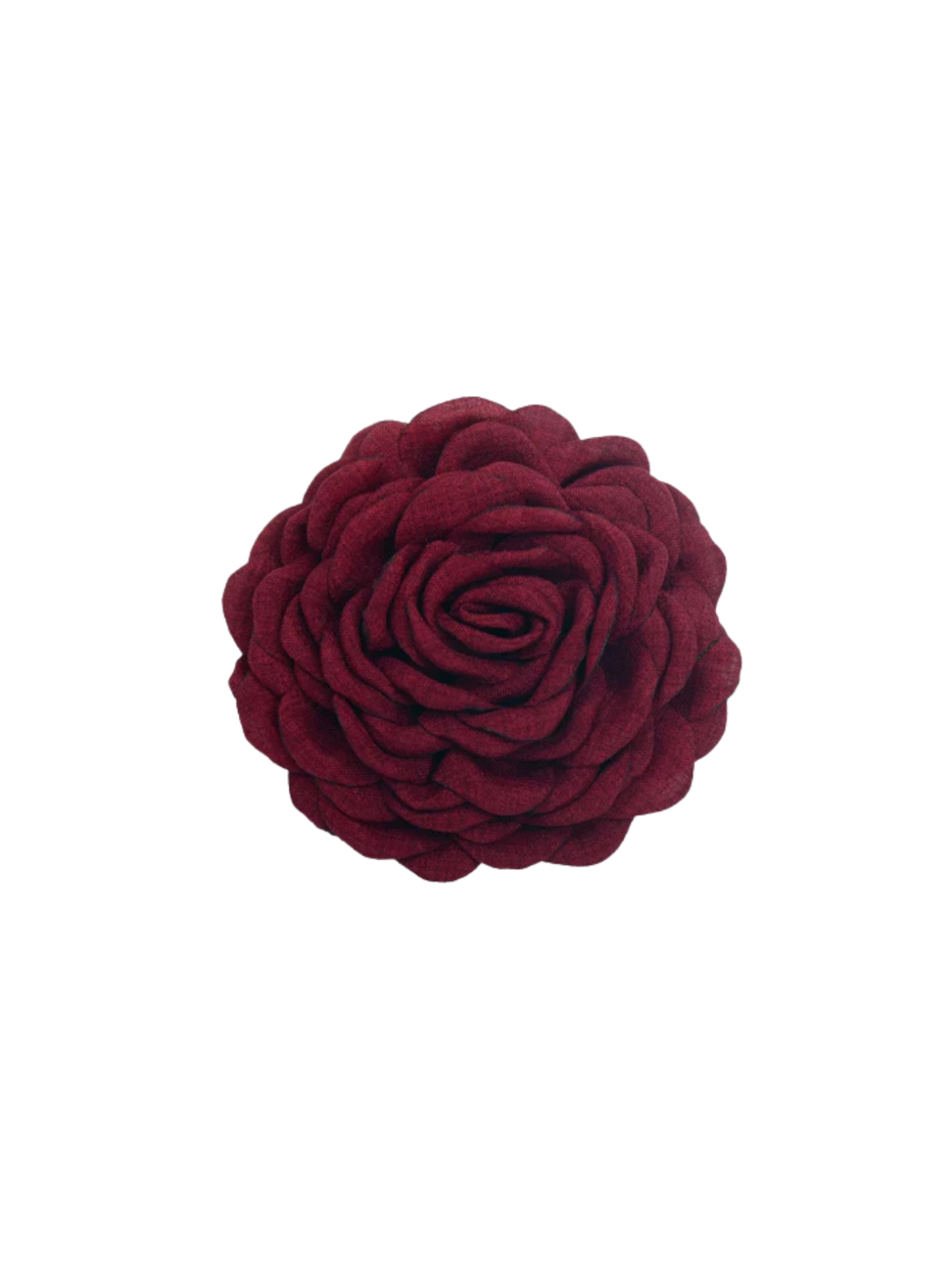 Denne stofblomst har et smukt og feminint udtryk med sine tætlagte kronblade i en dyb bordeaux nuance. Den roselignende form og den bløde tekstur giver et elegant og tidløst look, som nemt kan løfte ethvert outfit. Brug den som dekorativ detalje i håret, på en jakke, taske eller som accessory til festlige anledninger. En stilfuld lille detalje, der tilfører varme, farve og personlighed.
