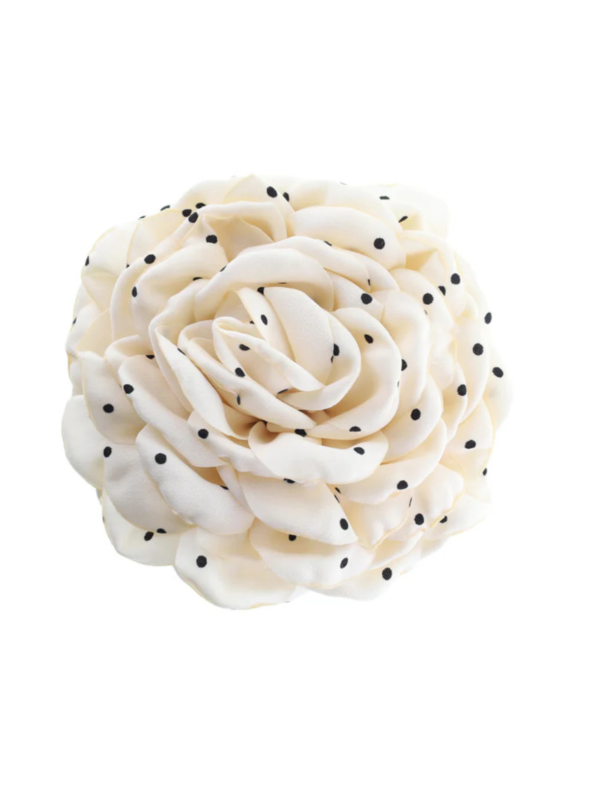 Denne lyse, cremefarvede stofblomst har et blødt og romantisk udtryk med sine fine, lagdelte kronblade, der danner en smuk roselignende form. Den sarte farve giver et elegant og feminint look, som passer perfekt til både hverdag og fest. Blomsten fungerer ideelt som en dekorativ accessory i håret, på en blazer, kjole eller taske og tilfører et stilrent og sofistikeret touch til ethvert outfit.