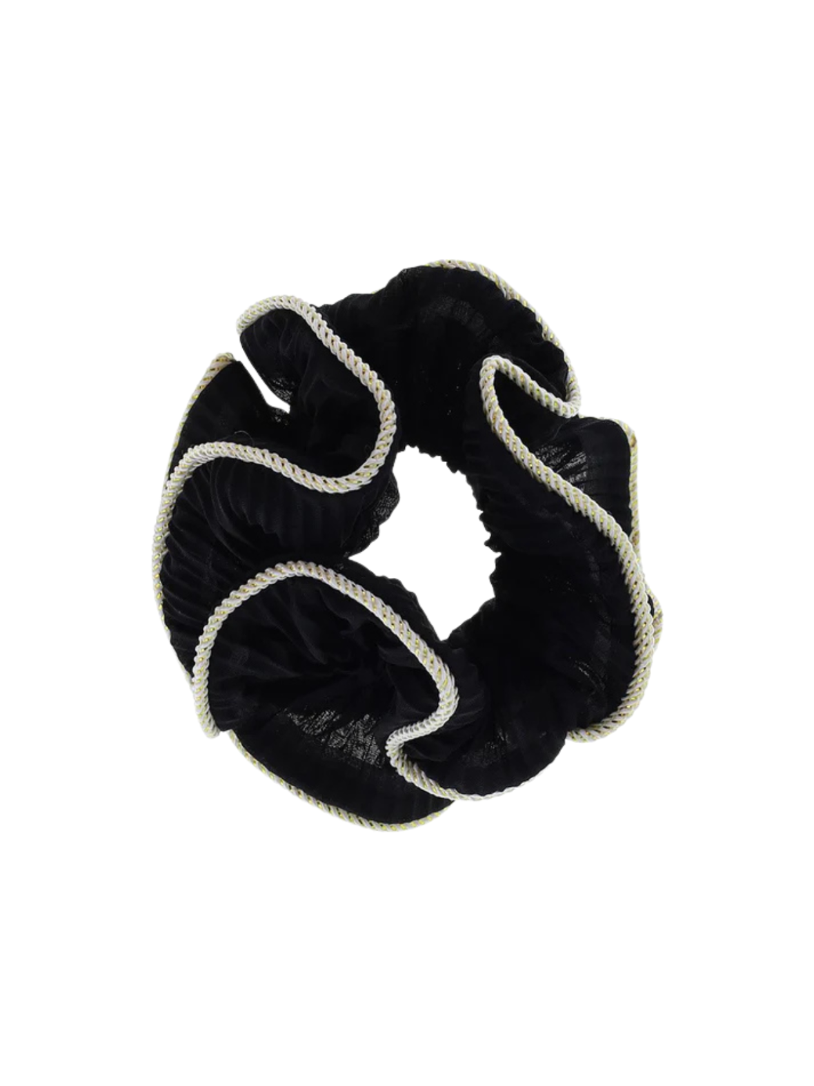 Denne scrunchie har et klassisk og elegant udtryk i sort, der gør den nem at matche med enhver garderobe. Det lette, plisserede stof giver et luftigt og blødt look, mens den fine kant med lys kontrast tilfører et eksklusivt og feminint touch. Scrunchien er skånsom mod håret og sikrer et godt hold uden at slide. Perfekt til både hverdag og fest – brug den i håret eller som en stilfuld detalje om håndleddet.