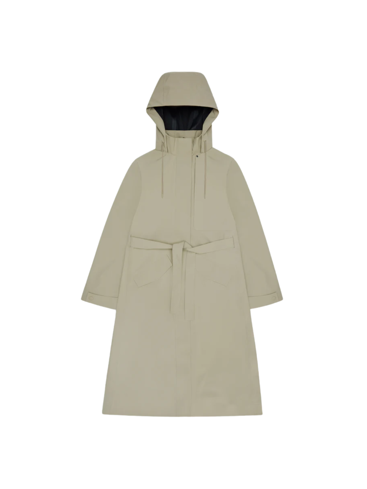 Elegant og funktionel regnfrakke i en lys beige nuance med et minimalistisk udtryk. Designet med hætte og skjult lukning giver optimal beskyttelse mod vind og vejr. Bindebæltet i taljen fremhæver silhuetten og tilfører et feminint touch. En stilfuld og praktisk jakke, der er perfekt til både byliv og regnfulde dage.