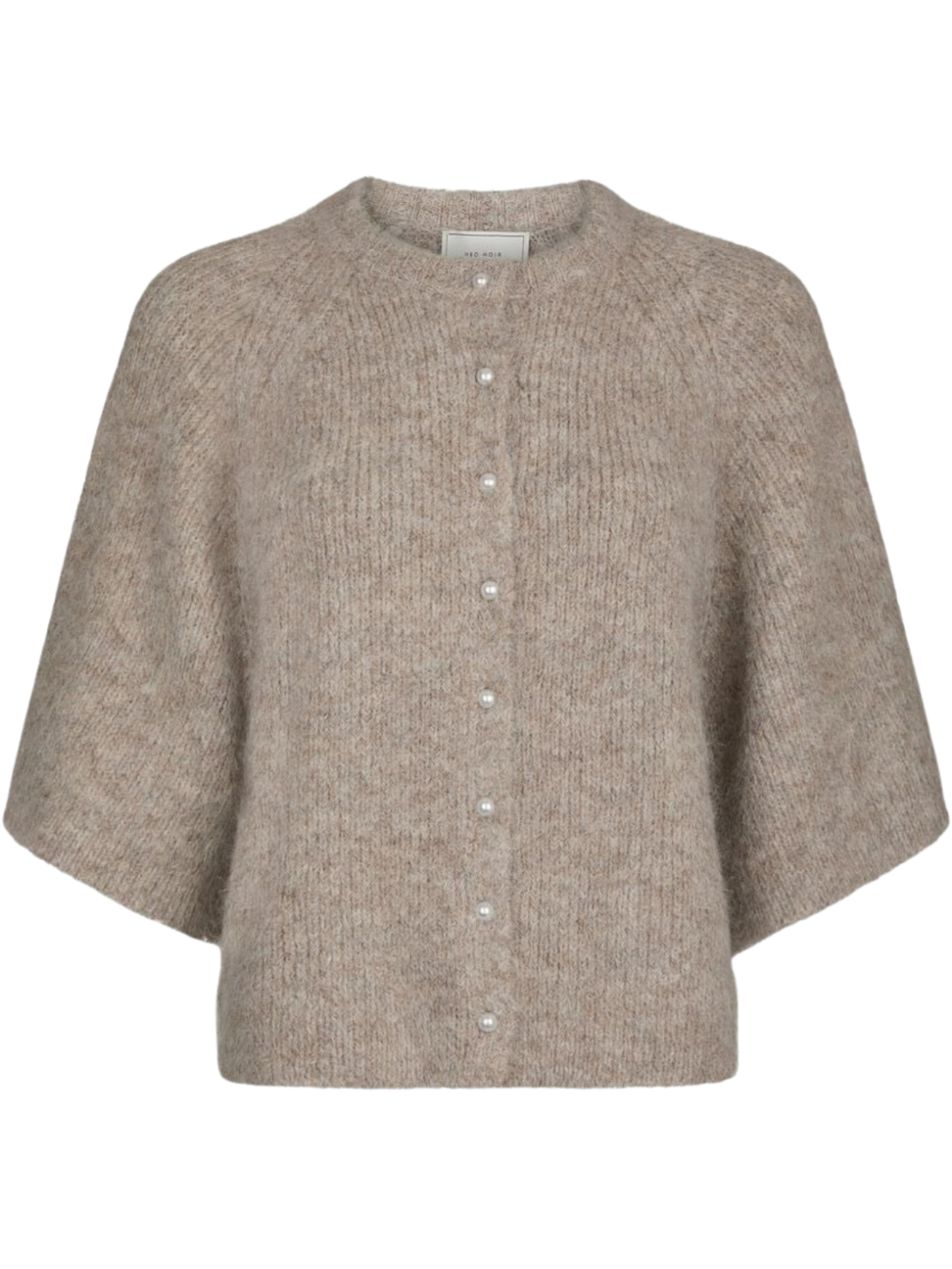 Denne bløde strikcardigan har et feminint og eksklusivt udtryk med korte, let vidde ærmer og en rund hals. Den fine strikstruktur giver et luftigt og behageligt look, mens de dekorative perleknapper foran tilfører et elegant og sofistikeret touch. Pasformen er afslappet, men stadig flatterende, hvilket gør cardiganen nem at style både til hverdag og mere festlige anledninger. Perfekt over en top, skjorte eller kjole, når du ønsker et varmt lag med et stilfuldt udtryk.