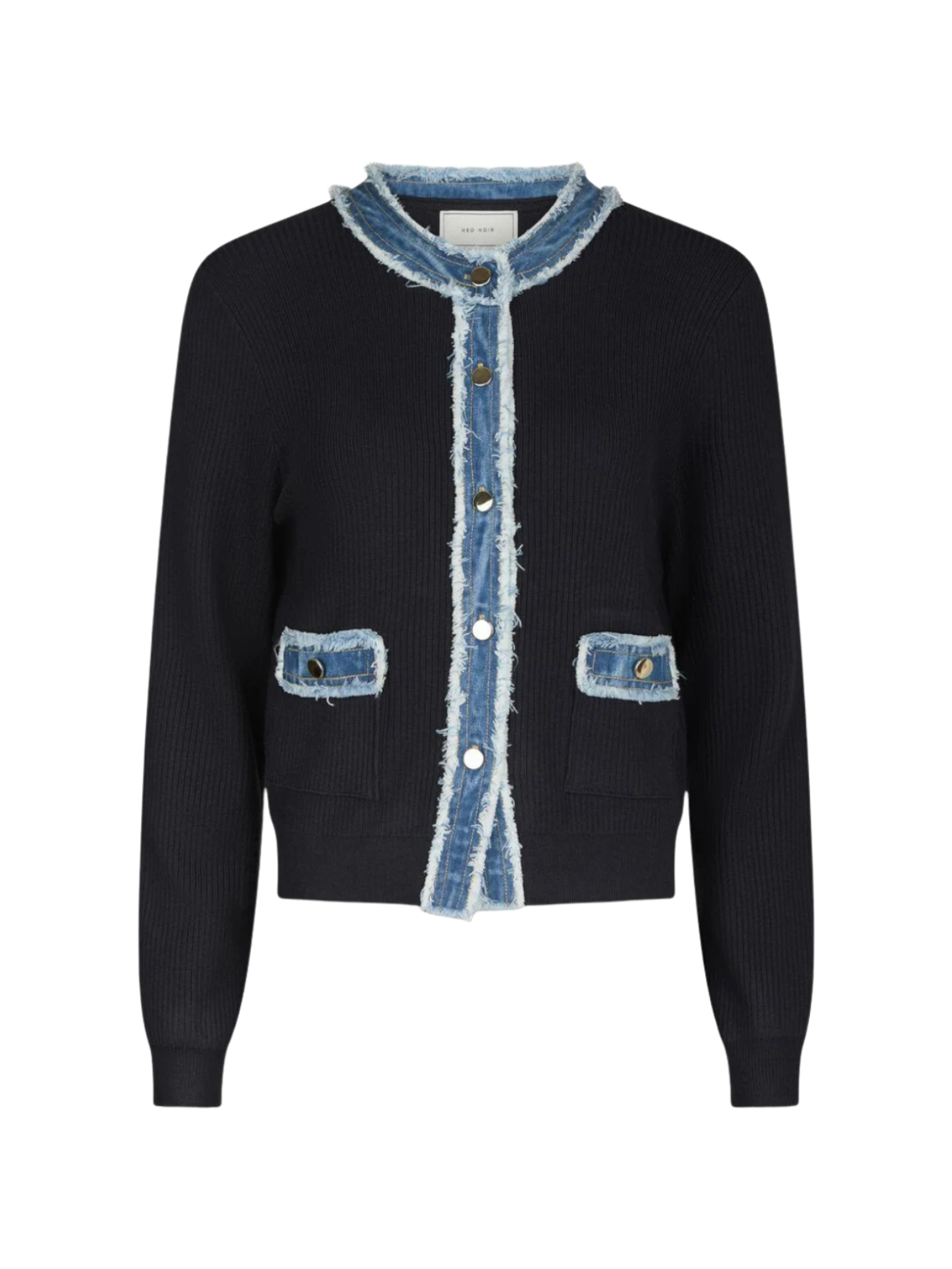 Denne cardigan kombinerer et klassisk striklook med rå denimdetaljer, der giver et moderne og eksklusivt udtryk. Den ribstrikkede kvalitet sikrer en behagelig pasform, mens de kontrastfyldte denimkanter langs fronten, kraven og lommerne tilfører et unikt twist. Cardiganen lukkes med knapper foran og har dekorative lommer, som understreger det elegante, men afslappede design. En alsidig style, der fungerer perfekt både til hverdagsbrug og til at pifte et mere enkelt outfit op.