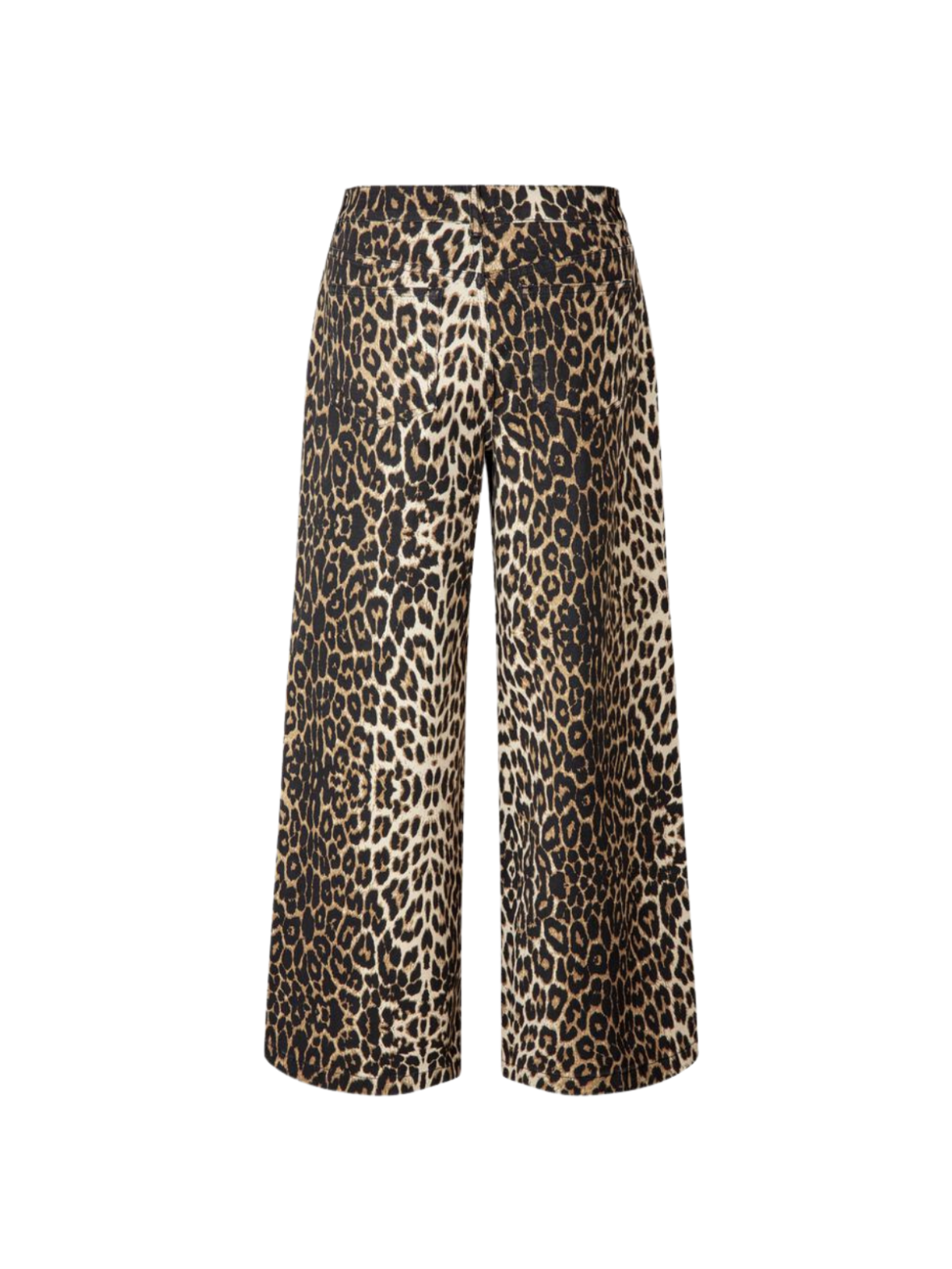 Disse bukser har et markant leopardprint, der giver et moderne og selvsikkert udtryk. De er designet med høj talje og lige, vide ben, som skaber en flot og afslappet silhuet. Det klassiske snit gør dem behagelige at have på, samtidig med at de bevarer et stilrent look. Bukserne kan nemt styles med en enkel top eller strik for et balanceret outfit, eller kombineres med en skjorte eller blazer for et mere gennemført og fashion-forward udtryk.