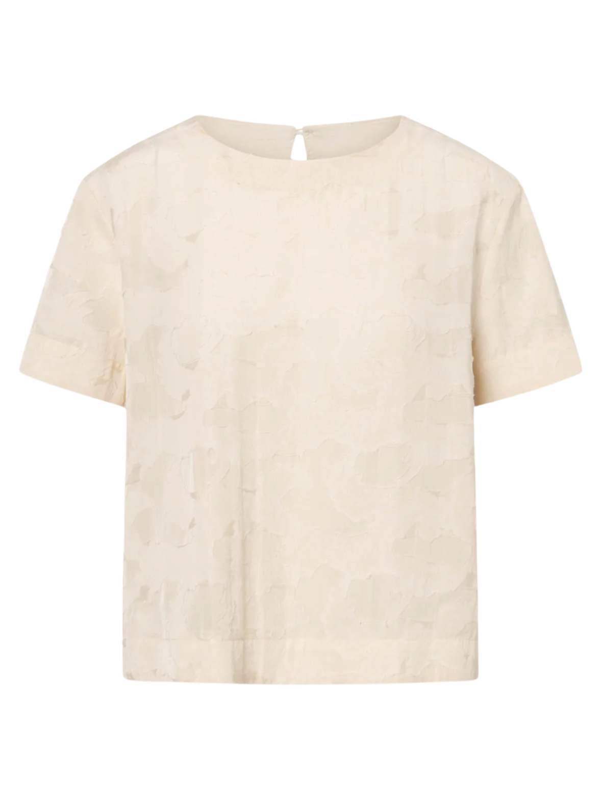 En let og elegant bluse i en smuk cremefarve med en diskret, struktureret overflade, der giver et eksklusivt og raffineret udtryk. Blusen har korte ærmer, en rund halsudskæring og en lille slids med lukning bagpå, som tilfører et feminint og gennemtænkt finish.