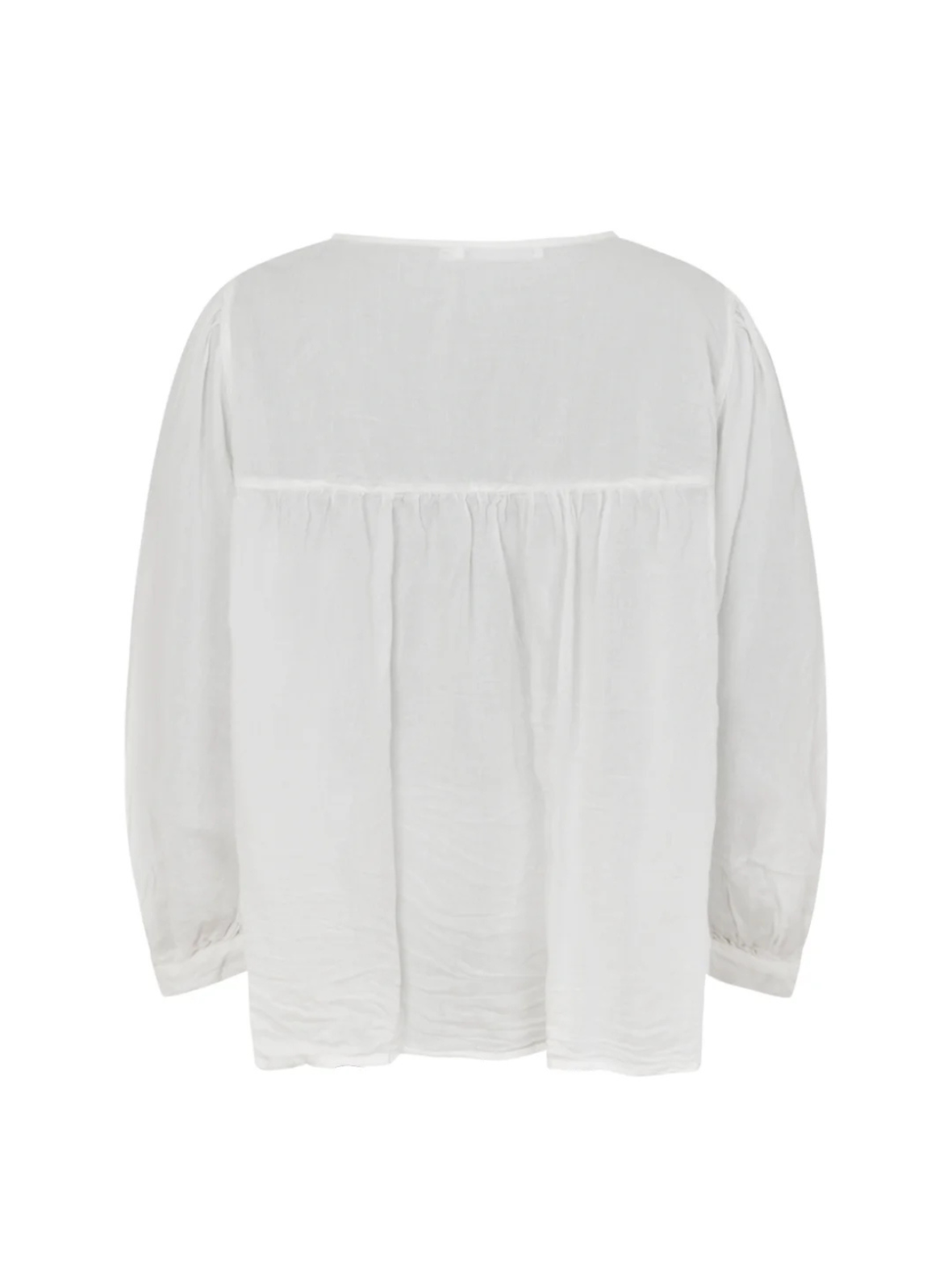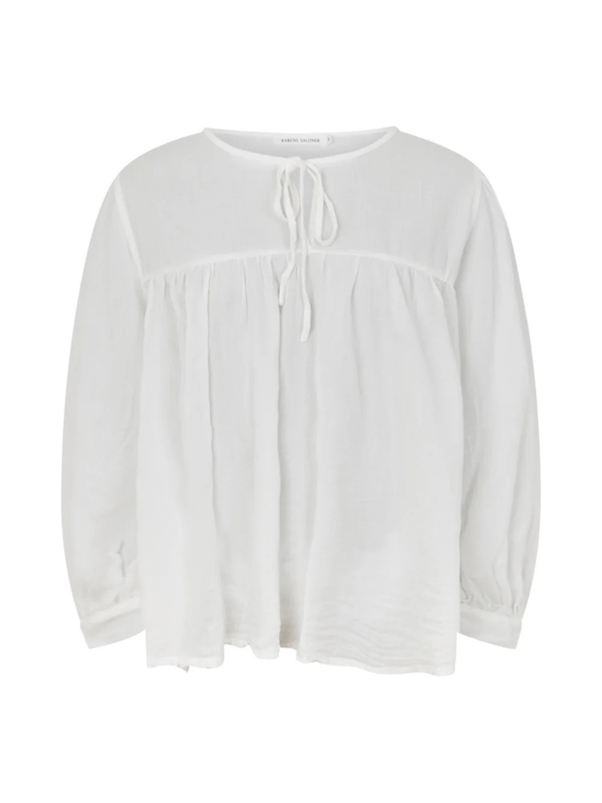 Denne bluse fra Rabens Saloner er en let og luftig model i en blød hvid nuance med et feminint udtryk. Designet har rund hals med bindebånd, let rynket skæring og lange ærmer, der giver en afslappet og elegant silhuet. Perfekt til både hverdag og mere afslappede anledninger.