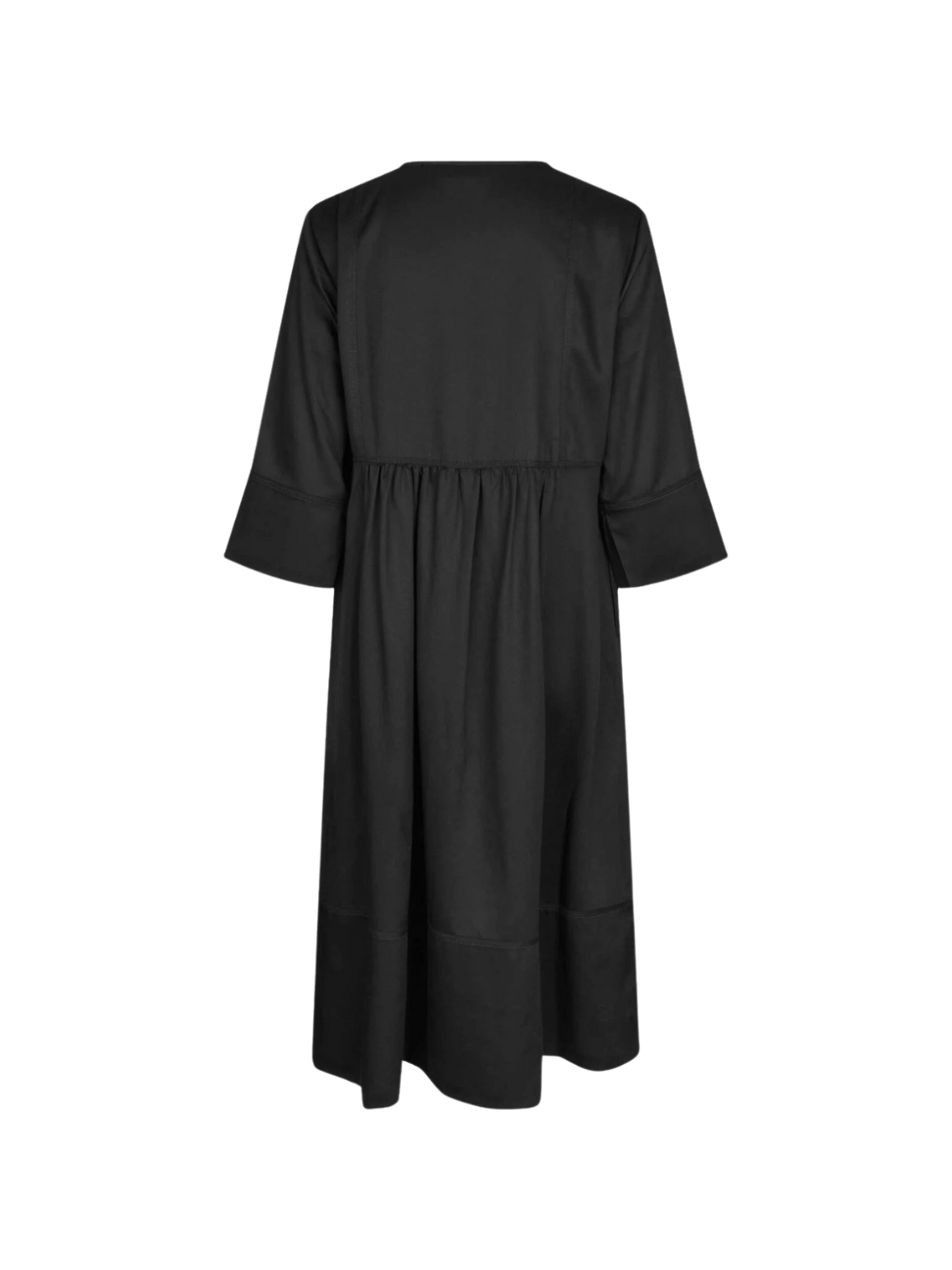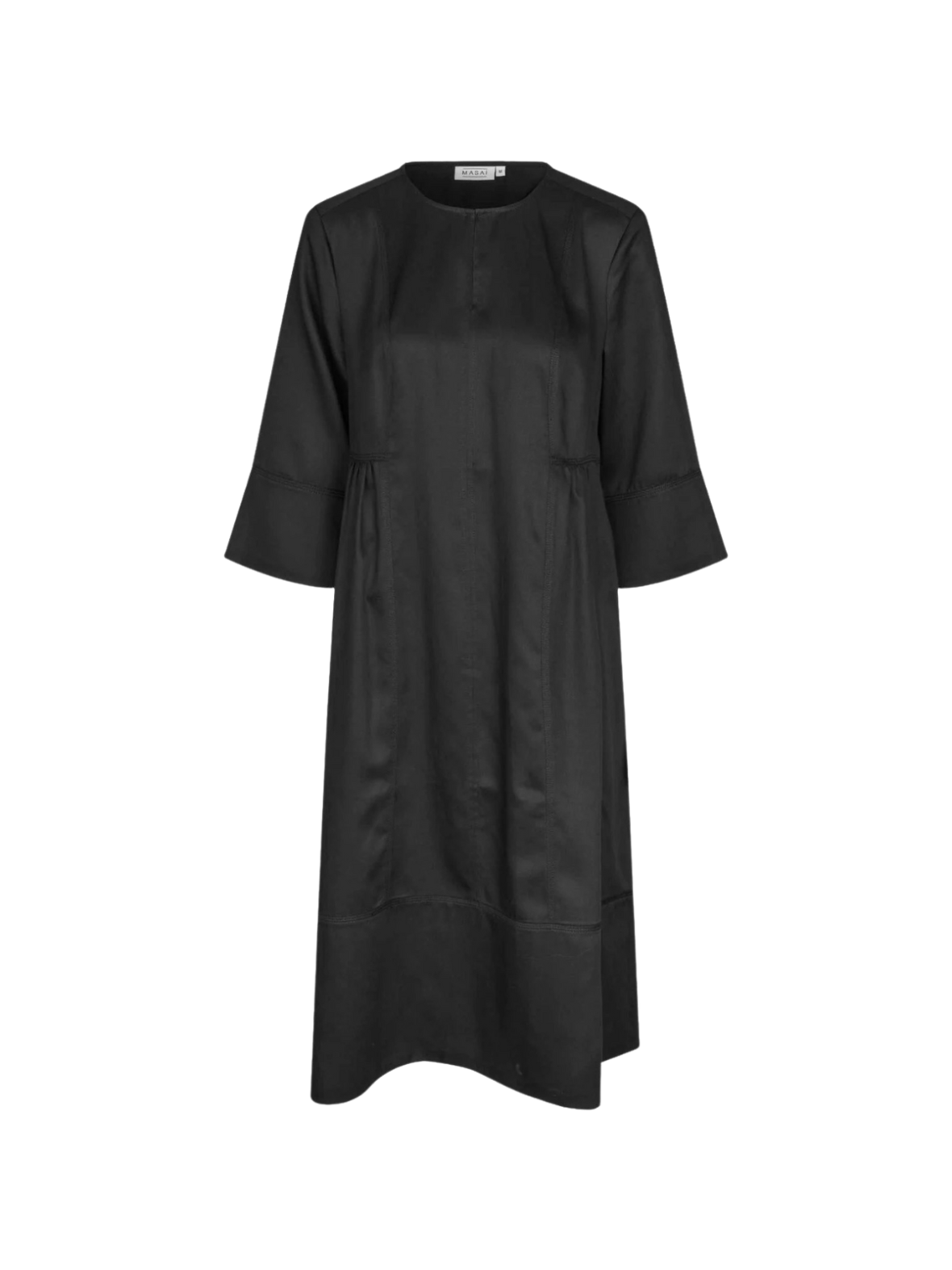 Denne sorte kjole fra Masai er et elegant og tidløst valg med fokus på komfort og bevægelse. Kjolen har en let A-formet silhuet, som falder flot langs kroppen og giver et afslappet, men stadig sofistikeret udtryk. De 3/4-lange ærmer med let vidde tilfører et feminint præg, mens de diskrete syningsdetaljer skaber struktur og form.