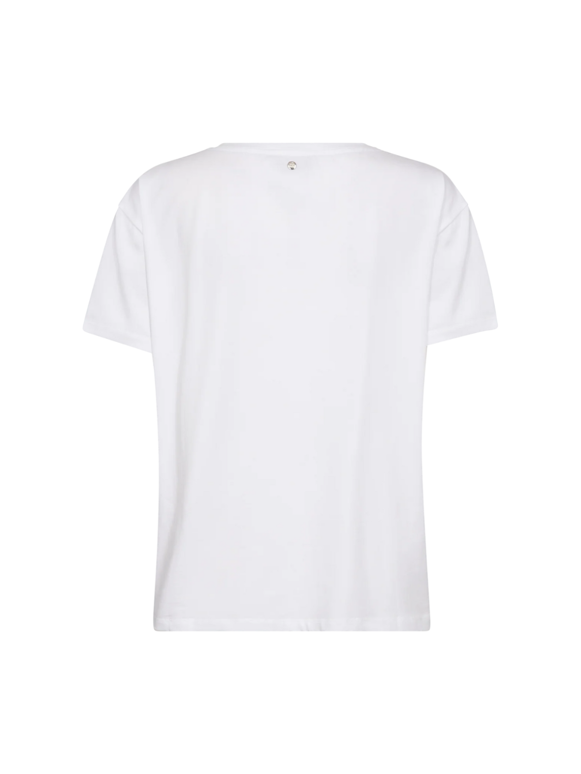 Denne t-shirt har et stilrent og feminint udtryk med et dekorativt logo-print på fronten. Den er lavet i en blød og behagelig kvalitet, som gør den komfortabel at have på hele dagen. Pasformen er afslappet med rund hals og korte ærmer, hvilket giver et moderne og casual look. T-shirten er nem at style med både jeans, bukser eller nederdel og fungerer perfekt som et alsidigt basisitem i garderoben – både alene og under blazer eller strik.