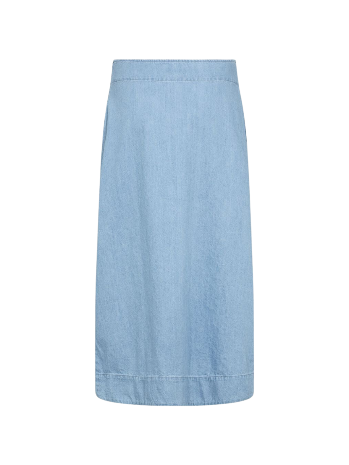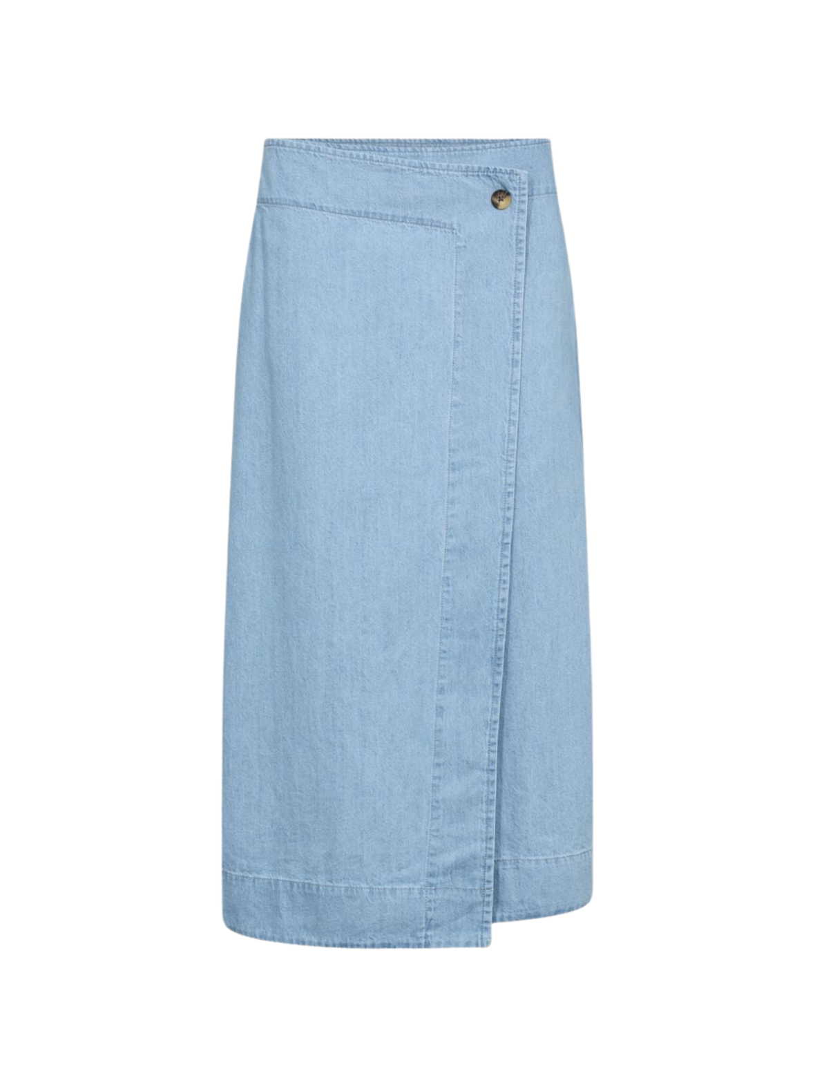 Denne lyseblå denimnederdel har et enkelt og feminint slå-om-design, der giver et afslappet og moderne udtryk. Nederdelen lukkes med knap i taljen og har et flot, lige fald, som gør den nem at style til både hverdag og mere pæne anledninger. Det bløde denimstof sikrer god komfort, mens længden giver et tidløst look. Brug den med en let skjorte, strik eller T-shirt for et ubesværet og stilrent outfit.