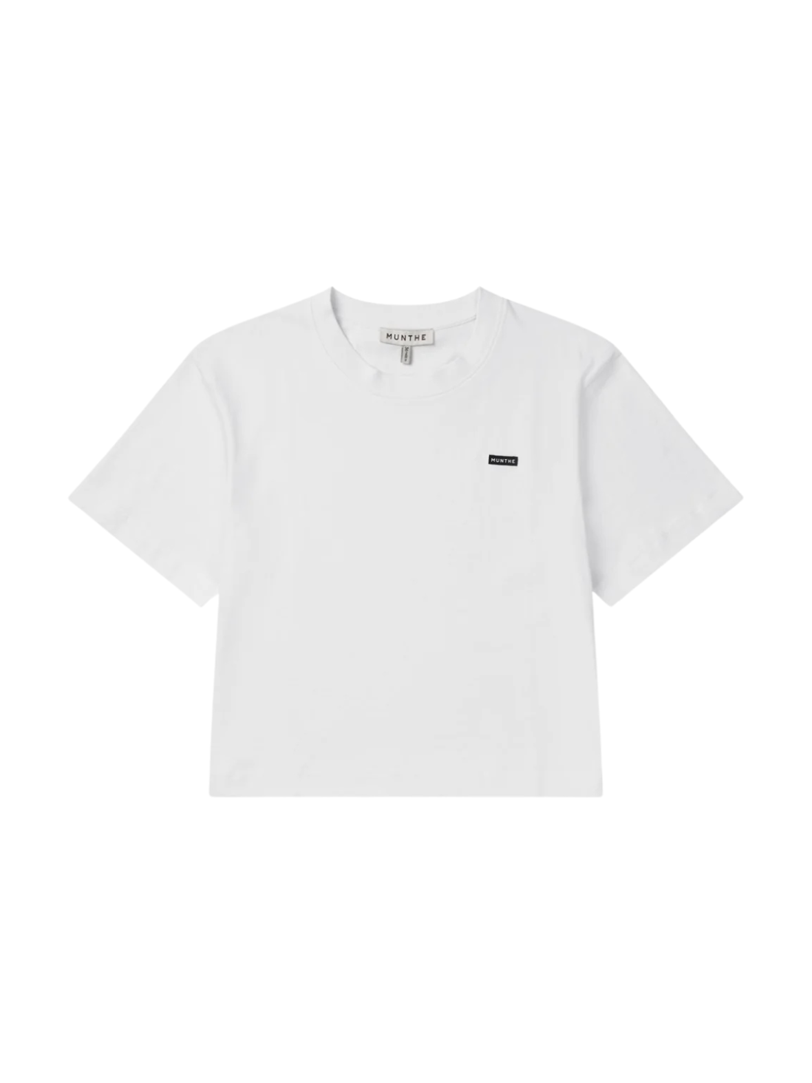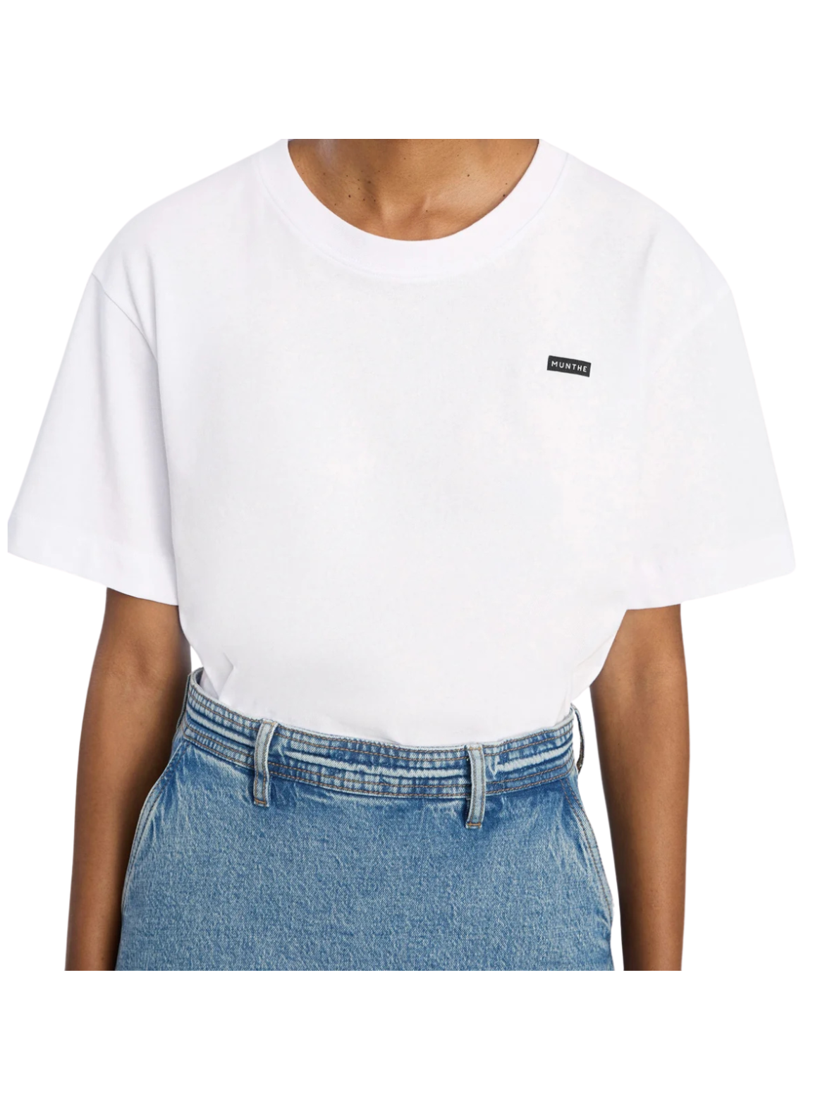 En klassisk hvid T-shirt fra Munthe med et enkelt og tidløst udtryk. T-shirten har rund hals, korte ærmer og et lille diskret logo på brystet, som giver et minimalistisk look. Et uundværligt basic-item i garderoben, der kan styles til alt.