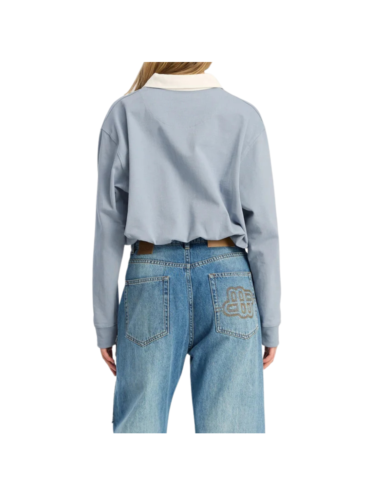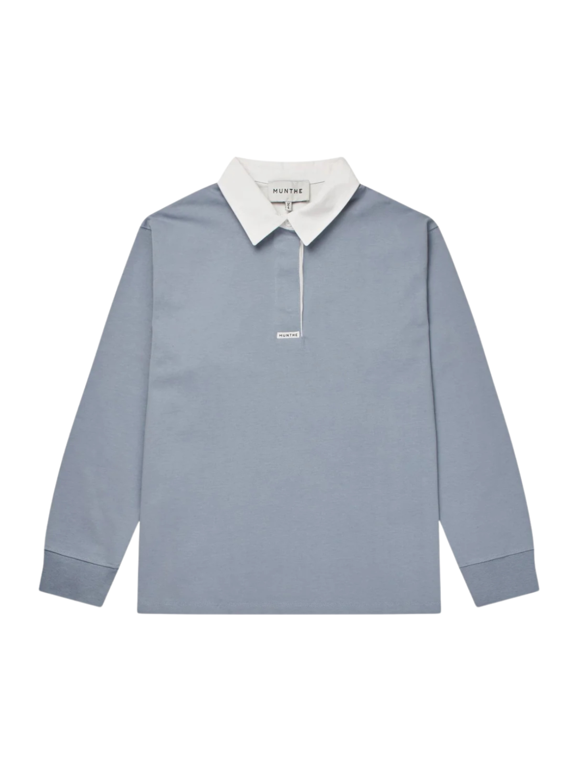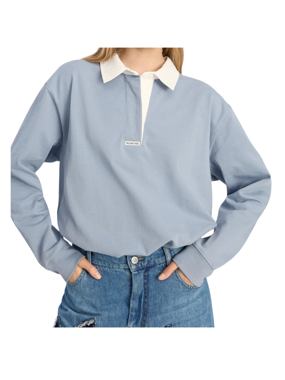 En lyseblå bluse fra Munthe med et enkelt og sofistikeret udtryk. Blusen har lange ærmer, en klassisk hvid krave og en kort stolpelukning foran, der skaber en fin kontrast. Det rene design gør den nem at style til både hverdag og mere formelle looks.