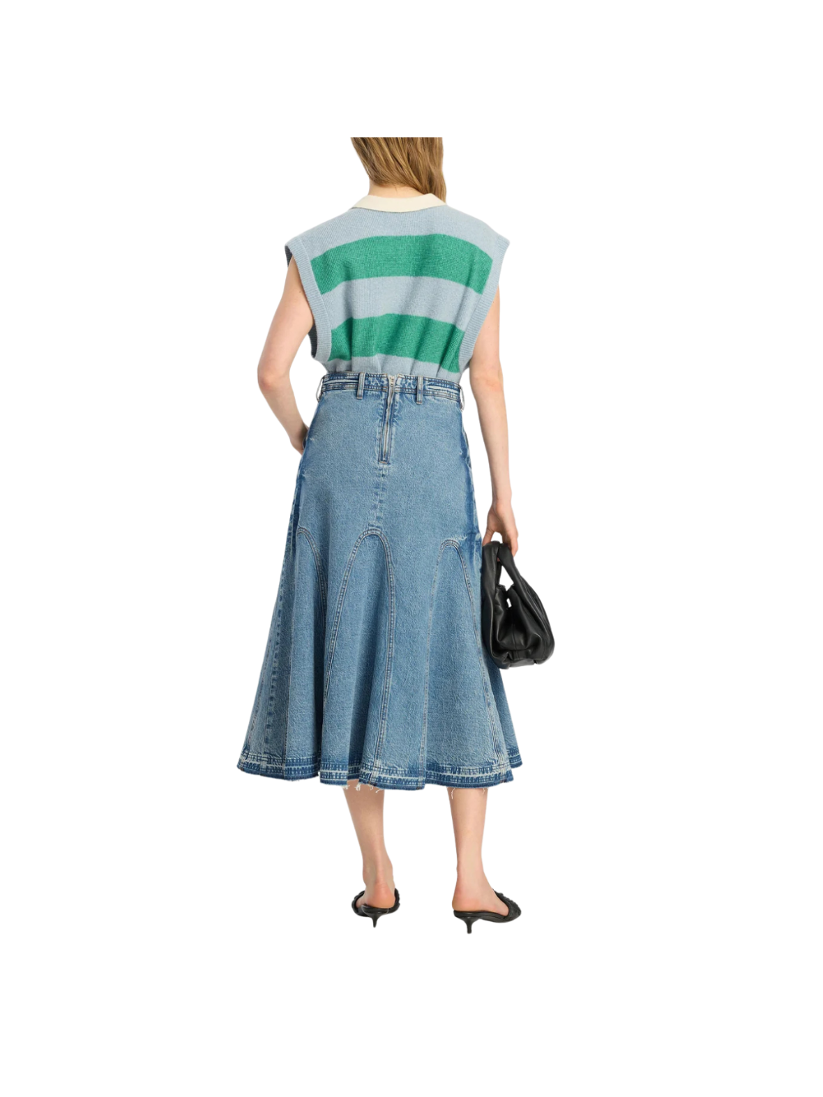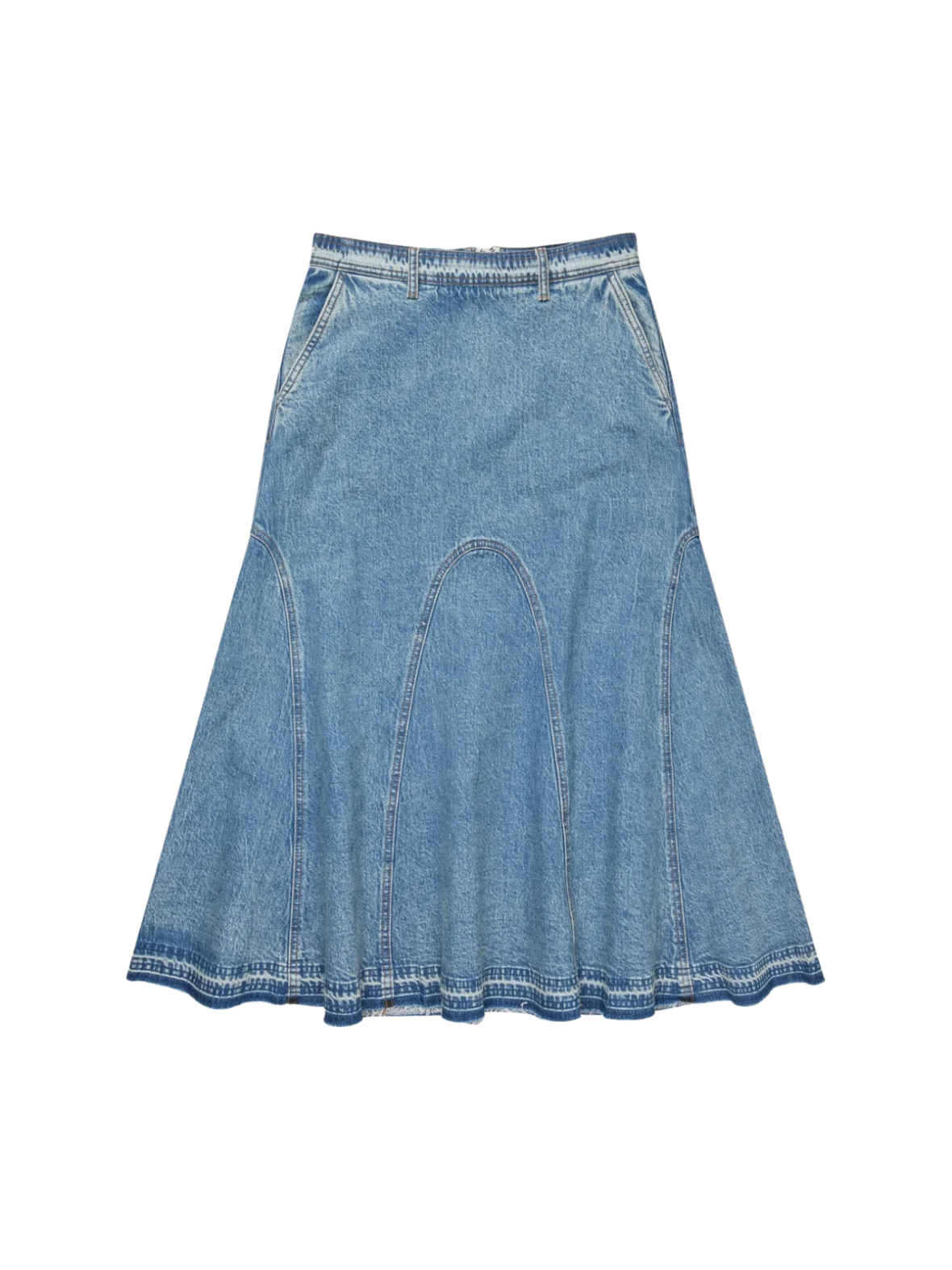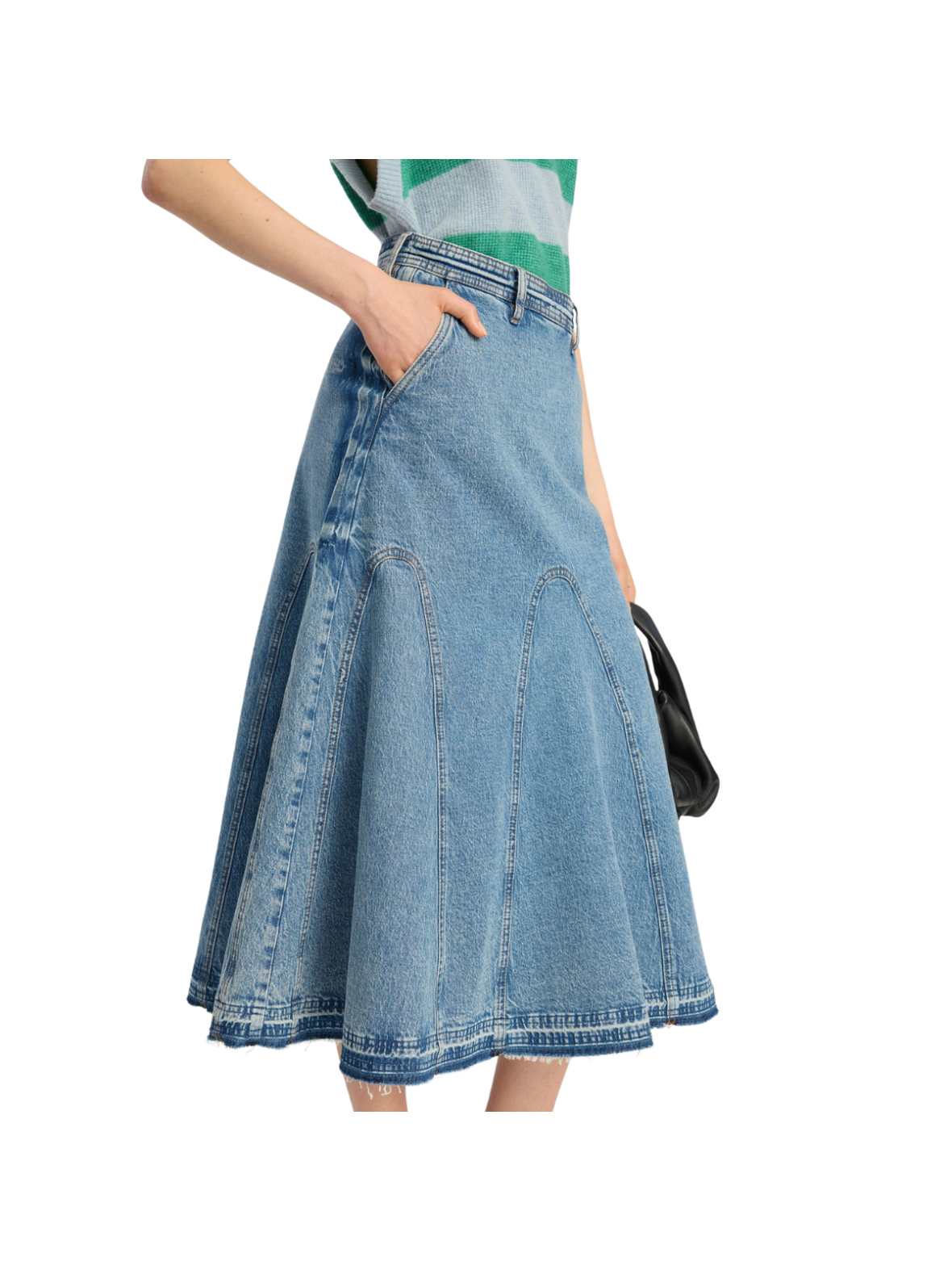 En denimnederdel fra Munthe med et moderne og feminint udtryk. Nederdelen har en flatterende A-form med dekorative syninger, der skaber flot bevægelse og struktur. Det klassiske blå denimlook gør den nem at style til både hverdag og mere elegante outfits.