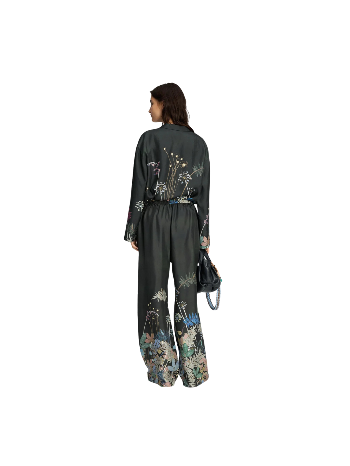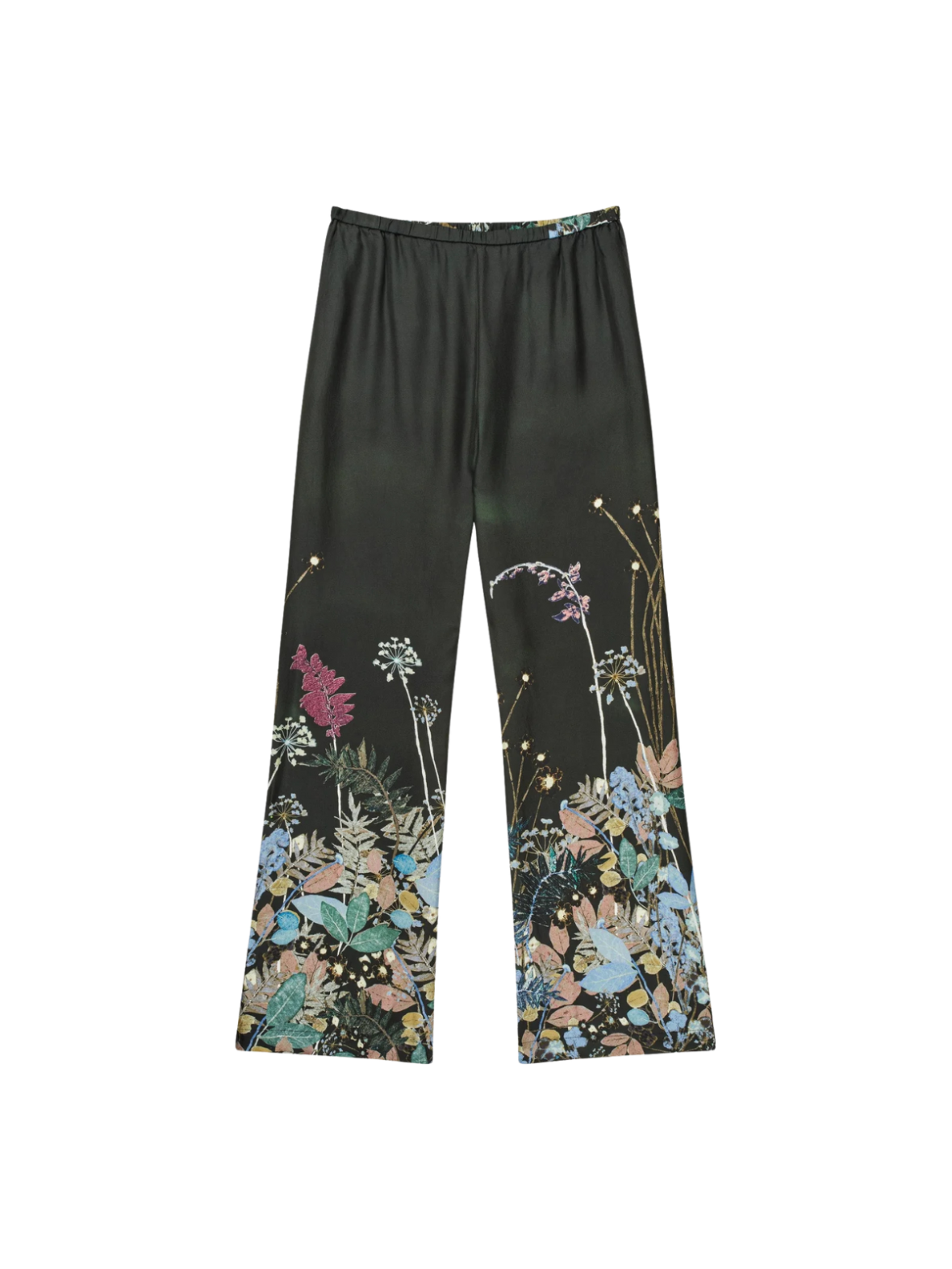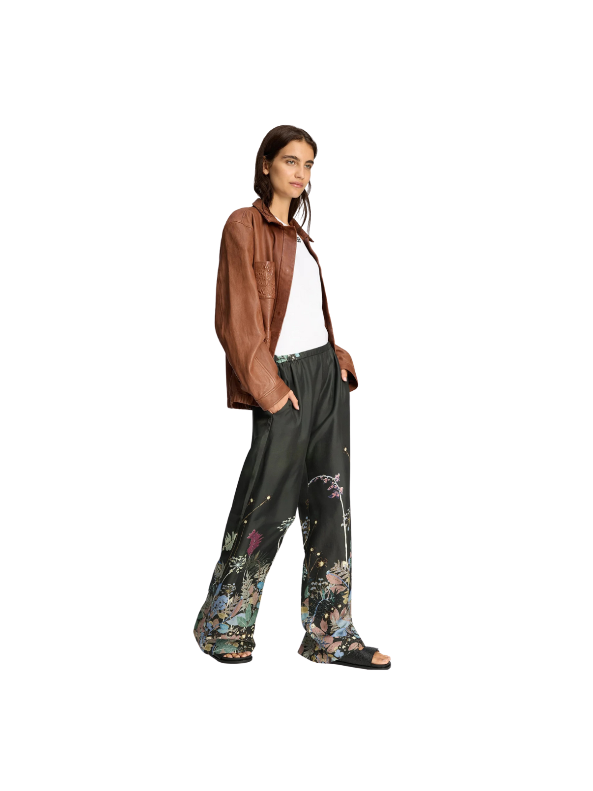 Et par sorte bukser fra Munthe med et smukt, kunstnerisk blomsterprint langs benene. Bukserne har et let, flydende materiale og lige ben, som giver et elegant og afslappet fald. Det dekorative print tilfører et feminint og eksklusivt udtryk, perfekt både til hverdag og særlige anledninger.