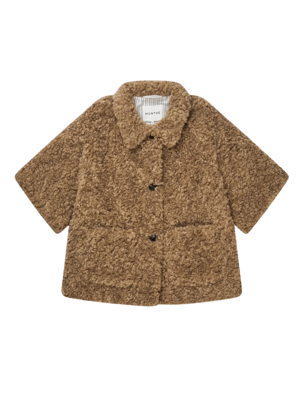 En kort, brun teddyjakke fra Munthe med et blødt og struktureret udtryk. Jakken har klassisk krave, korte ærmer og knaplukning foran samt påsatte lommer, der giver et afslappet og moderne look. Perfekt som let overgangsjakke eller som et statement-lag i garderoben.