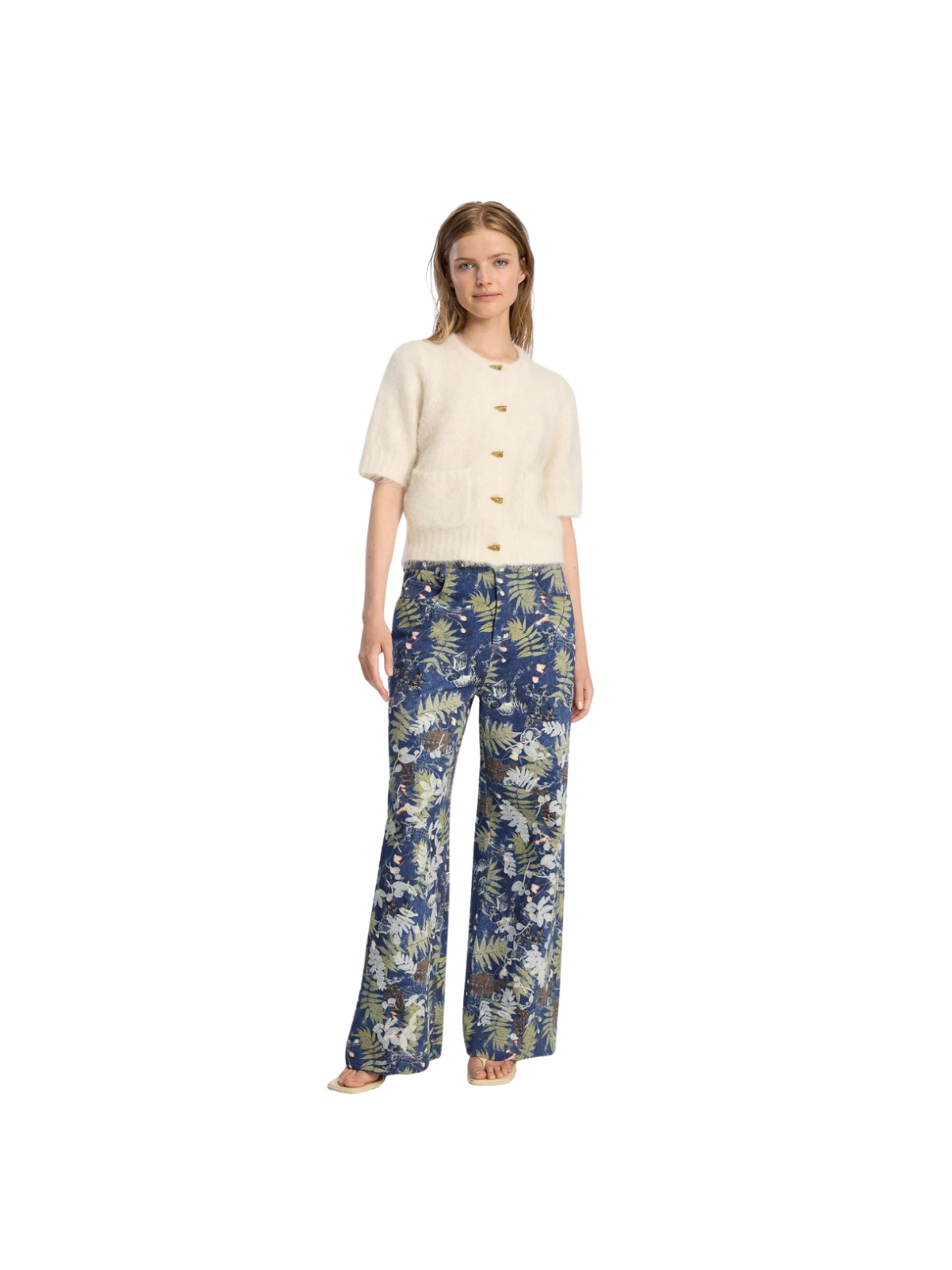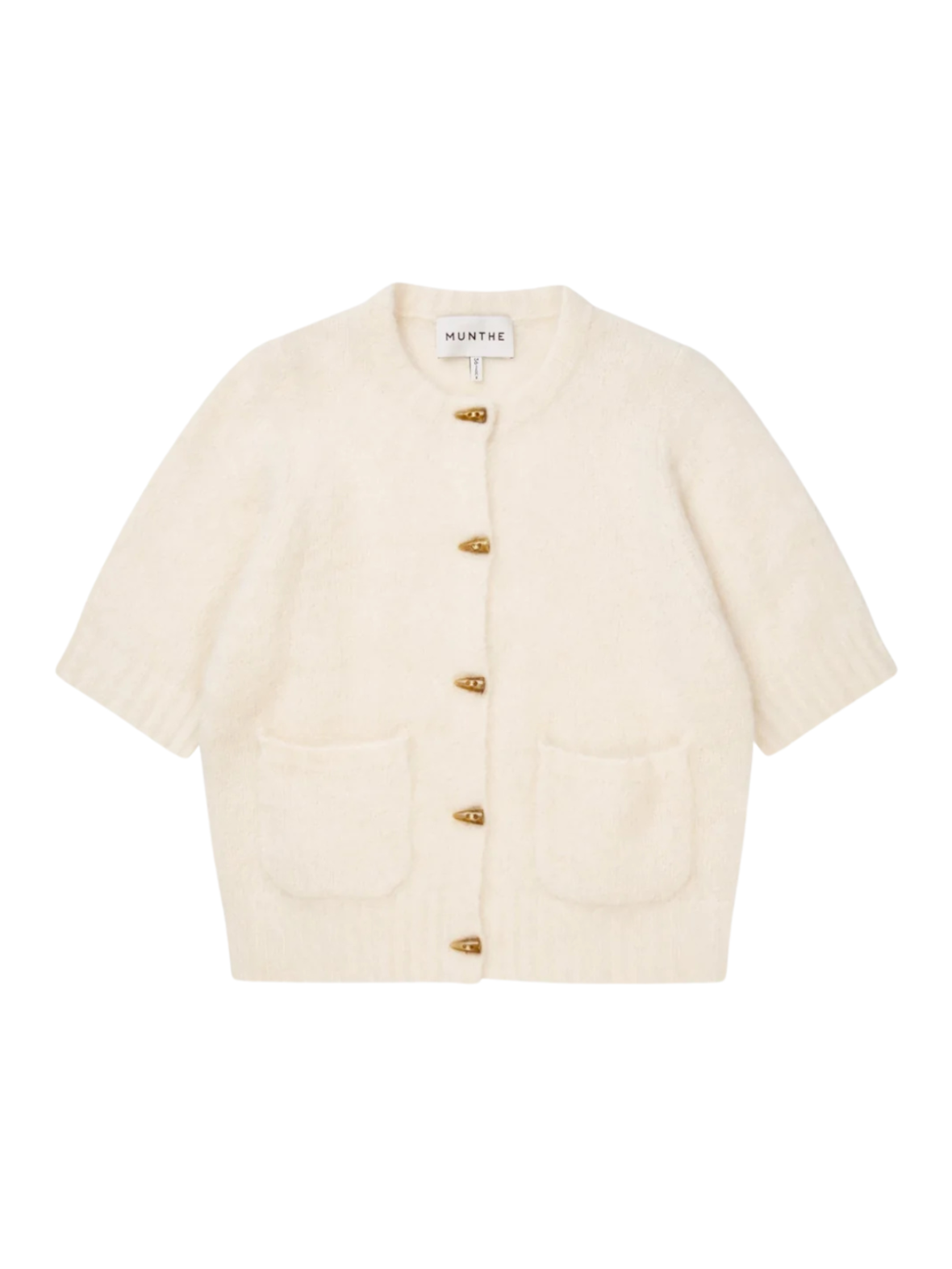 En blød, cremefarvet cardigan fra Munthe i et let, fuzzy strikmateriale. Den har rund hals, korte ærmer og lukkes foran med små gyldne knapper, som giver et elegant og afslappet udtryk.