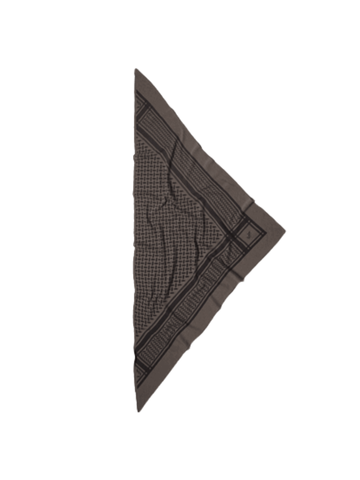 Elegant trekantet tørklæde i en smuk gråbrun nuance med et klassisk og grafisk mønster. Den lette og bløde kvalitet giver et eksklusivt udtryk, mens designet tilfører et stilrent og tidløst touch. En alsidig accessory, der kan styles på flere måder – brug det om halsen, i håret eller som en dekorativ detalje på din taske for et gennemført look.