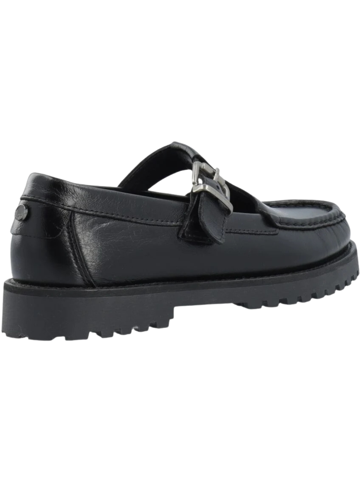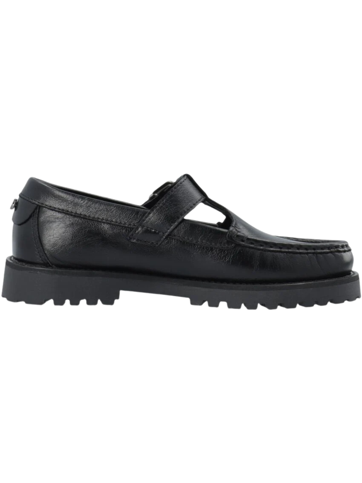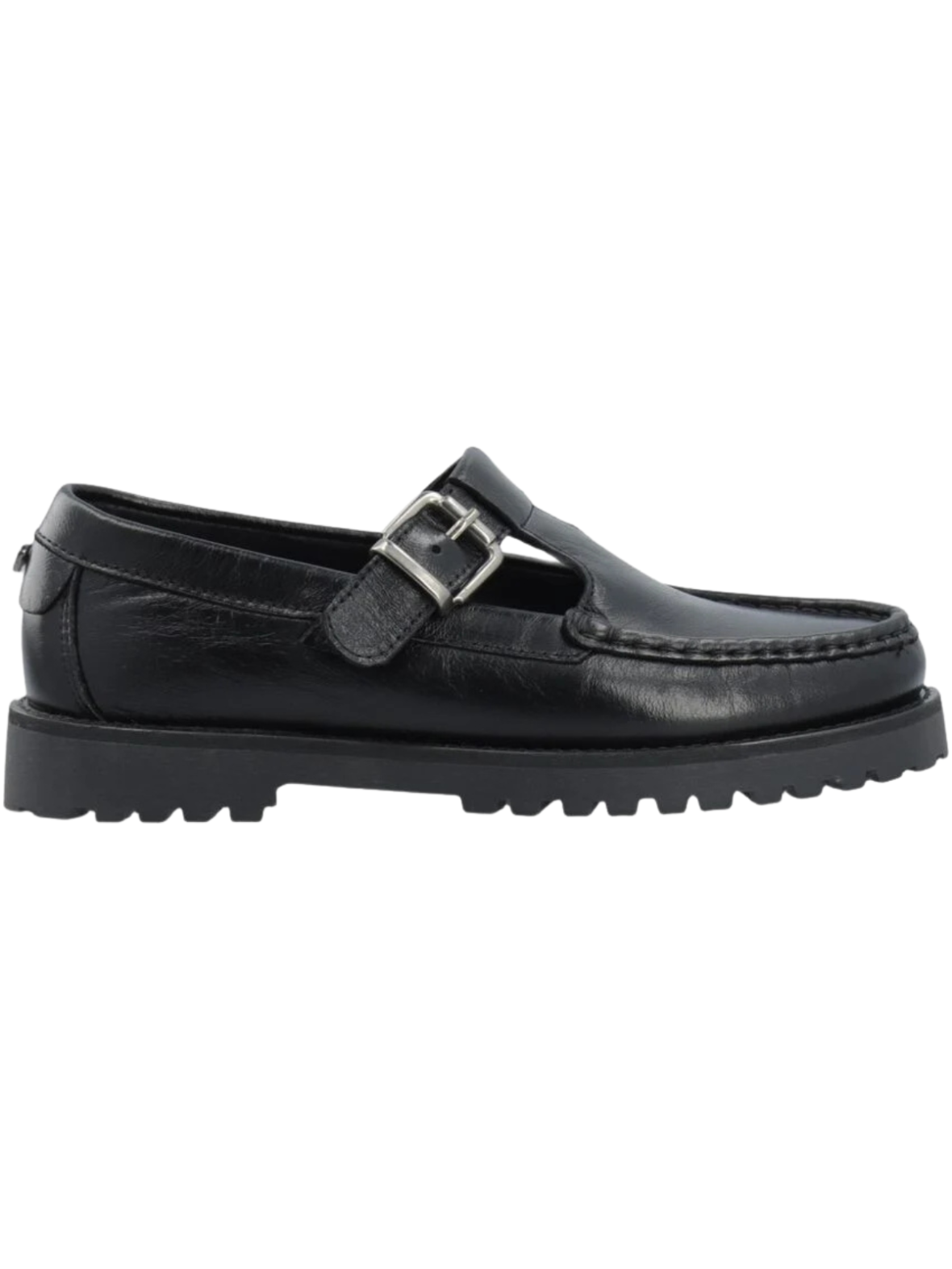 Disse loafers kombinerer et klassisk udtryk med et moderne twist. Skoen er udført i glat, sort læder med synlige stikninger langs kanten, som giver et eksklusivt og tidløst look. Den dekorative rem med metalspænde over vristen tilfører karakter og gør designet lidt mere markant. Den kraftige, let profilerede sål sikrer god komfort og stabilitet hele dagen. Et alsidigt valg, der fungerer lige godt til både hverdagsbrug og mere formelle outfits.