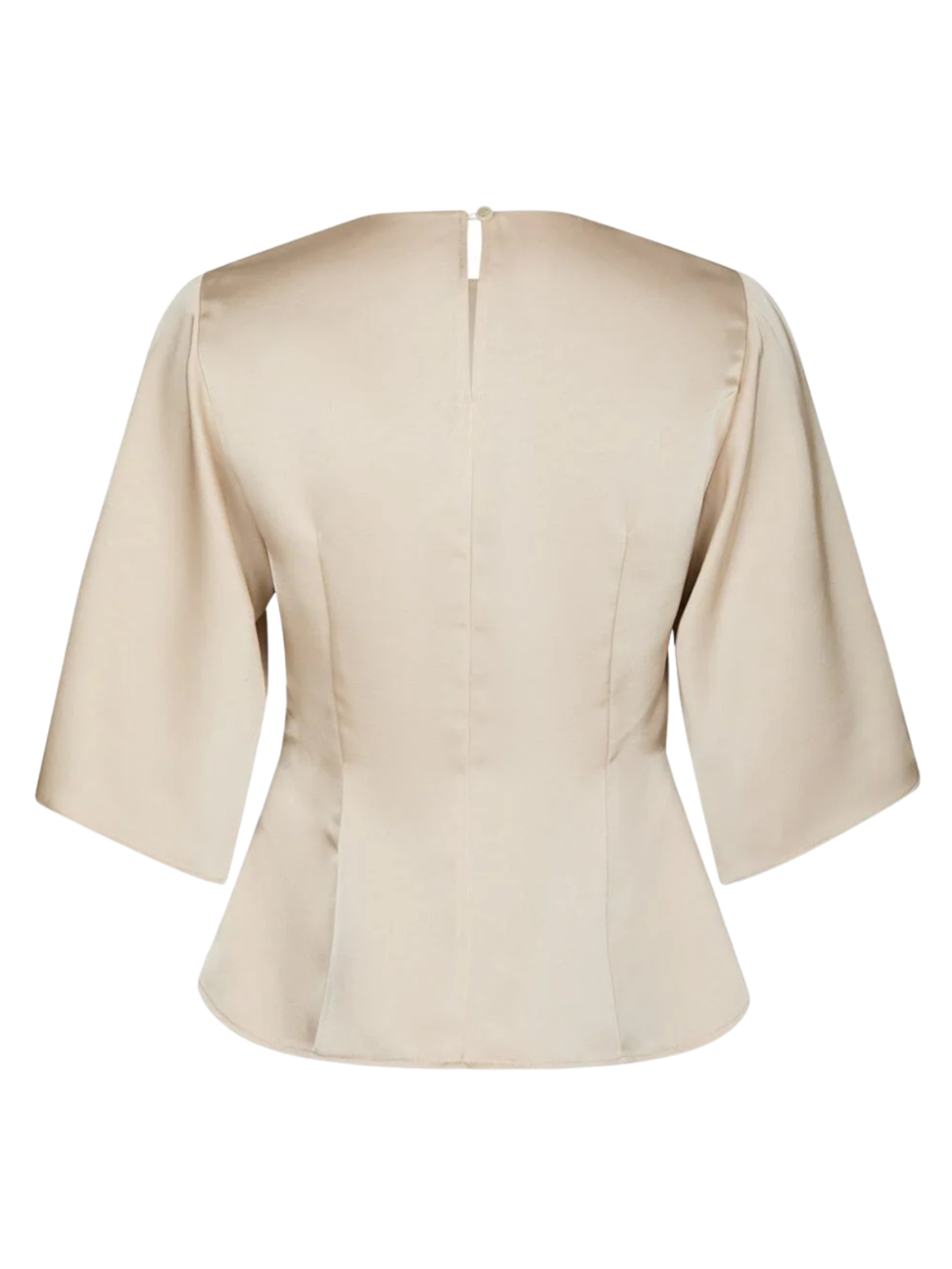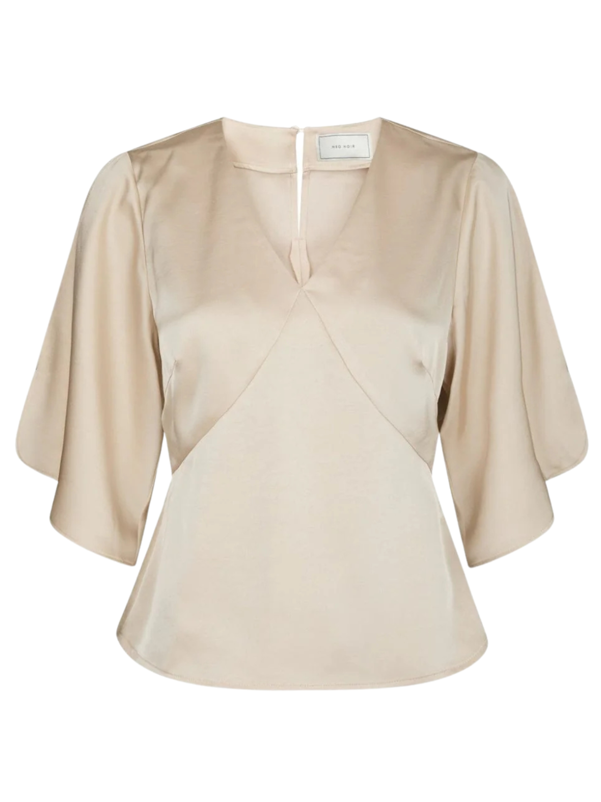 Denne elegante bluse har et feminint og sofistikeret udtryk med fine detaljer. Den er designet med en flatterende V-udskæring og smukke krydsende syninger foran, som giver en let figursyet silhuet. De løse, albuelange ærmer skaber et blødt fald og tilfører et luftigt og eksklusivt look. Blusen lukkes diskret i nakken og er fremstillet i et let, glat materiale, der føles behageligt mod huden. Perfekt til både hverdag og fest, hvor den nemt kan styles med både bukser og nederdel.