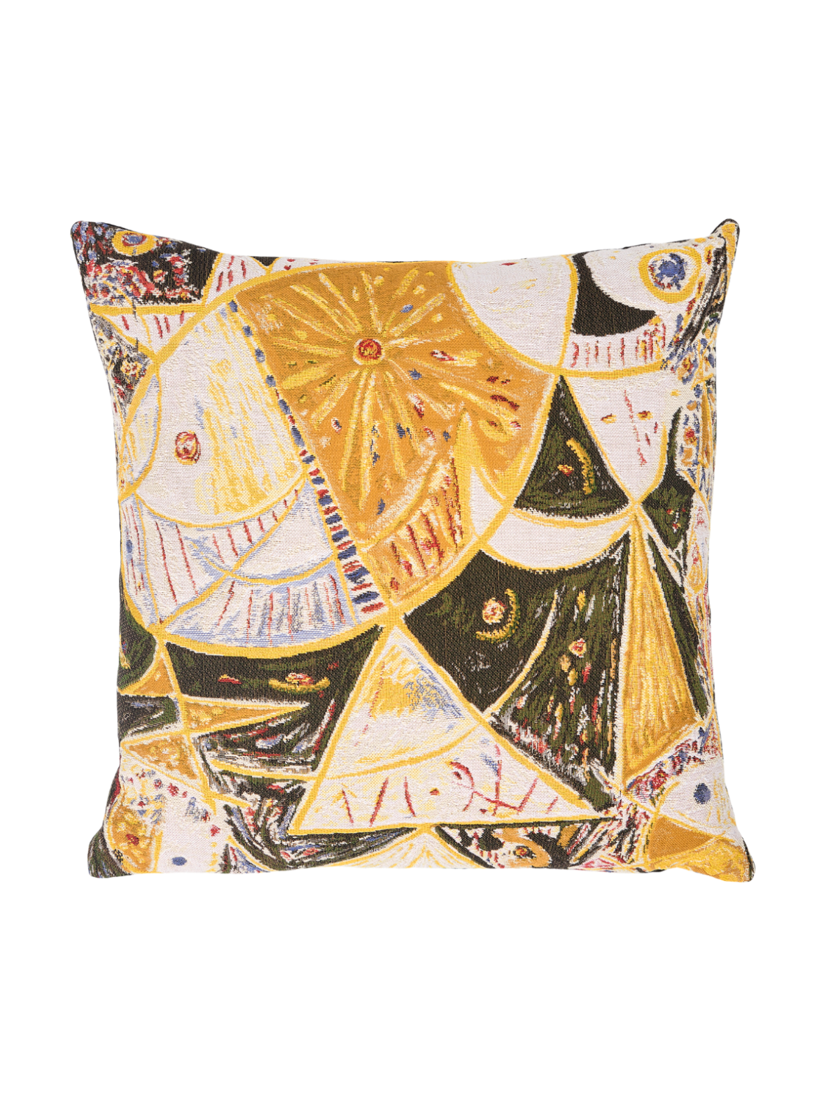 Tilfør hjemmet et kunstnerisk og eksklusivt præg med denne dekorative pude med abstrakt mønster. Det grafiske design i varme gule nuancer kombineret med grønne, cremefarvede og fine kontrastdetaljer skaber et levende udtryk, der tilfører både dybde og karakter til din indretning.