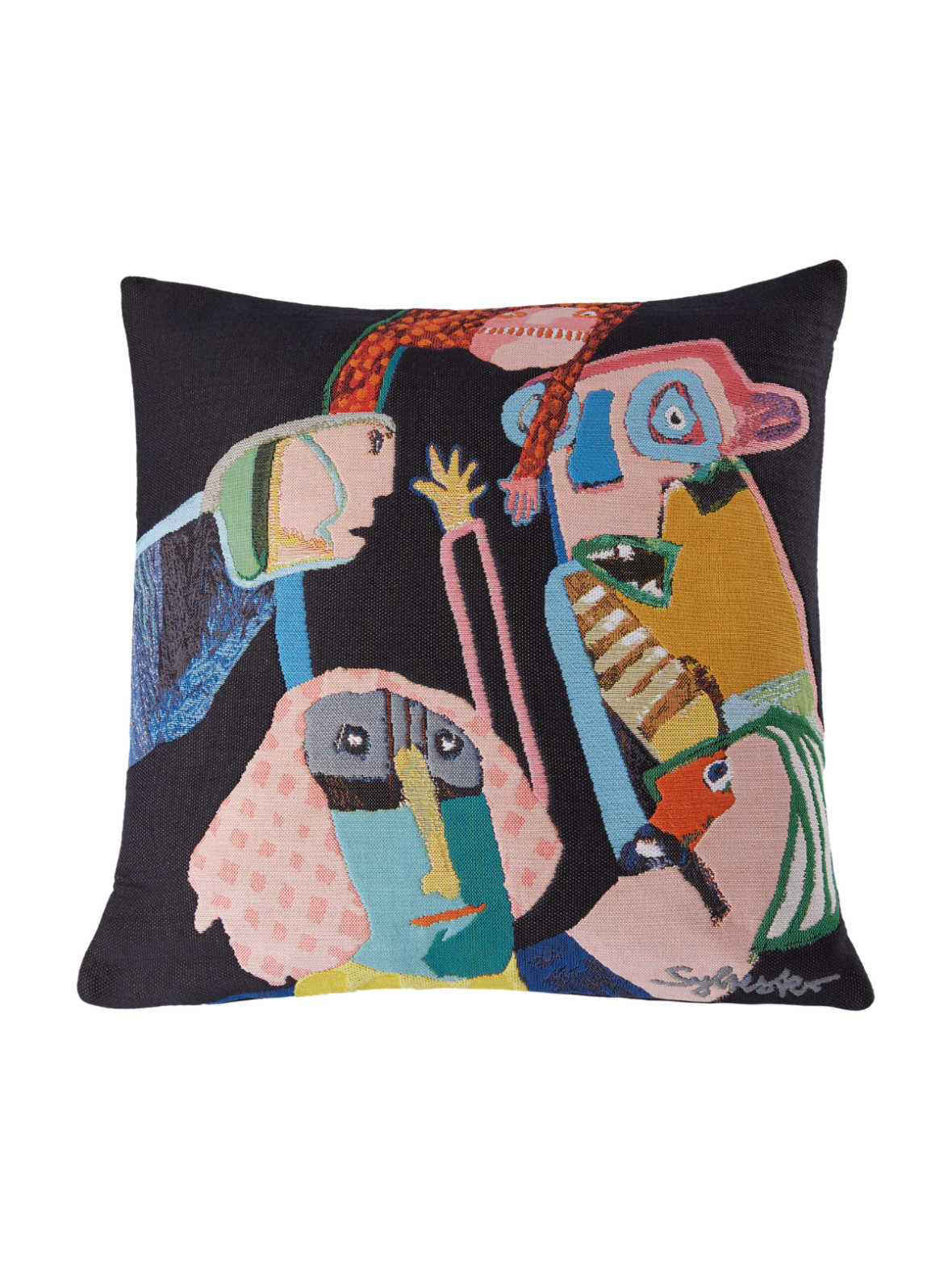 Denne unikke pude er et farverigt kunstværk i sig selv og tilfører hjemmet et kreativt og legende udtryk. Motivet består af abstrakte figurer og ansigter i stærke kontrastfarver, der skaber dynamik og masser af personlighed. Det vævede tekstil giver en eksklusiv struktur og fremhæver de kunstneriske detaljer på smuk vis.