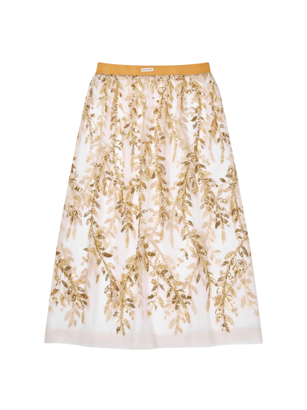En let og elegant lang nederdel i transparent kvalitet med fine, broderede detaljer. Det gyldne bladmønster giver et eksklusivt og dekorativt udtryk, mens den bløde underkjole sikrer komfort og bevægelse. Den elastiske talje gør nederdelen behagelig at have på og nem at style. Brug den med en enkel top eller strik for et afbalanceret look, eller kombiner den med en mere festlig overdel til særlige anledninger.