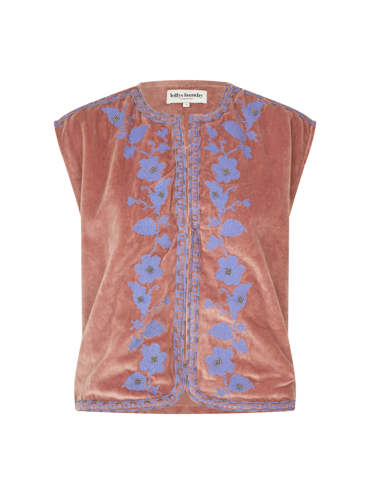Smuk og feminin vest fra Lollys Laundry i en blød dusty rose nuance med fine blå broderidetaljer. Den eksklusive velourkvalitet giver et elegant og luksuriøst udtryk, mens de dekorative blomster- og fuglemotiver skaber et unikt og kunstnerisk look. Vesten har en rund halsudskæring og åbent frontdesign, hvilket gør den ideel til lag-på-lag styling. De smukke broderede kanter langs åbningen og nederst fuldender det gennemførte design.
