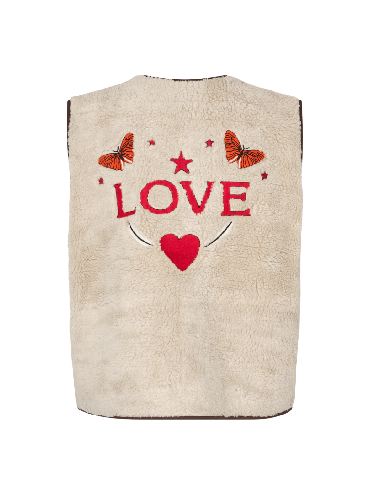 Blød, cool og fuld af personlighed. Denne skønne vest fra Lollys Laundry er designet i en lækker, vamset teddy-kvalitet, der giver et varmt og hyggeligt udtryk – perfekt som lag-på-lag over skjorter, kjoler eller strik.