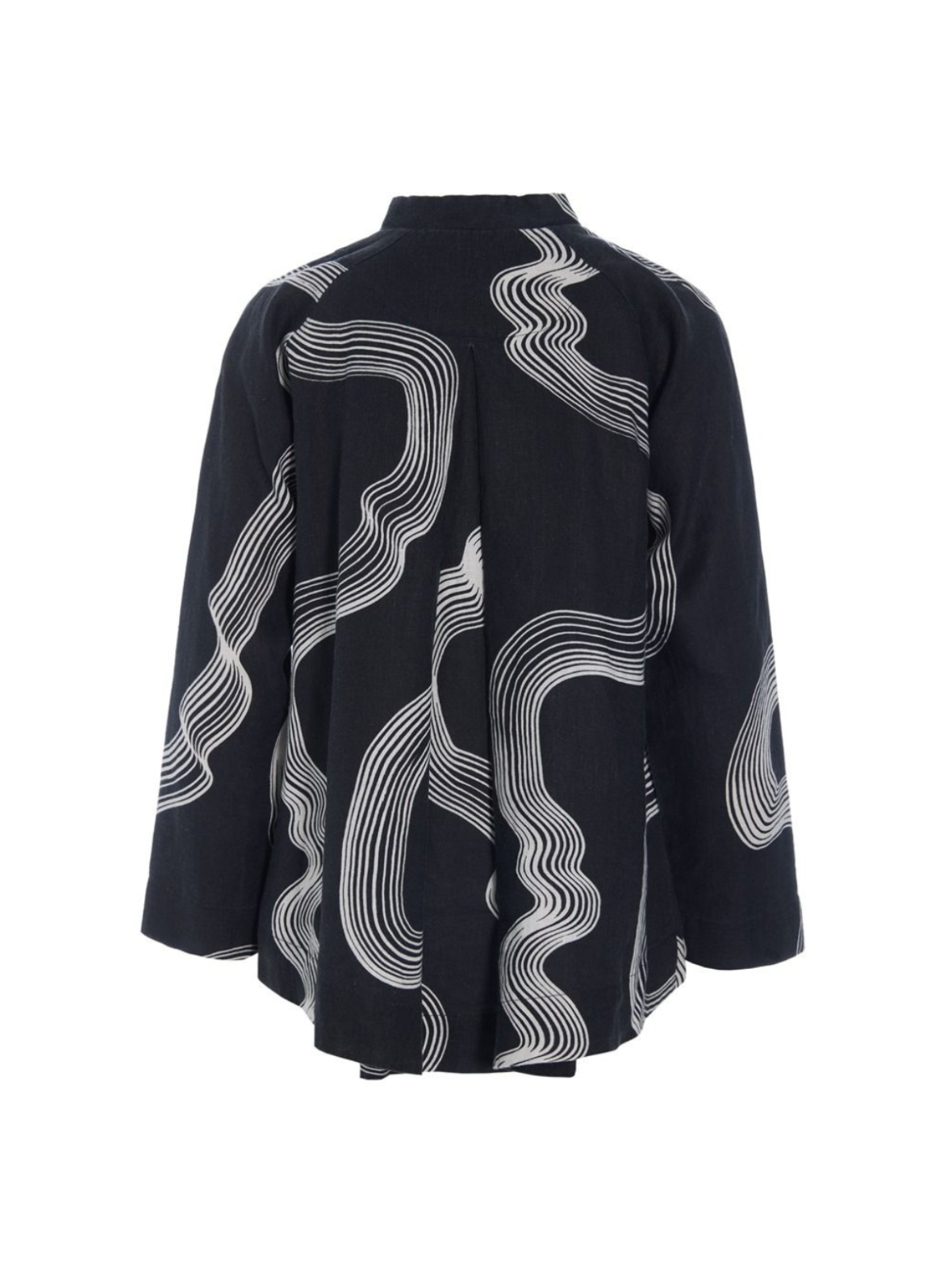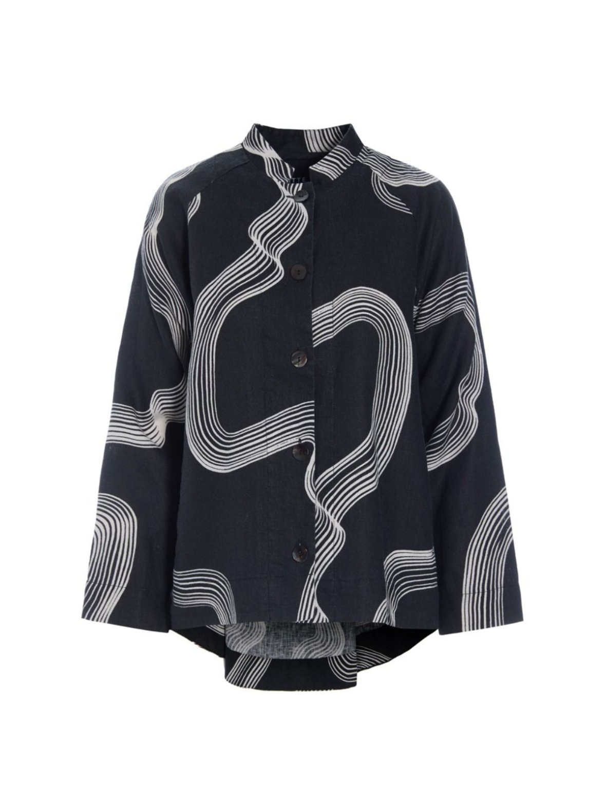 Denne elegante skjorte kombinerer et grafisk udtryk med en afslappet og moderne silhuet. Det sorte design brydes af bløde, bølgende linjer i kontrastfarve, som giver et kunstnerisk og iøjnefaldende look. Skjorten har rund hals med lille ståkrave og knaplukning foran. De lange ærmer og den let løstsiddende pasform giver et stilrent og komfortabelt udtryk, mens den lidt længere bagkant skaber et flot fald. Den kan styles både til hverdag og mere elegante anledninger.