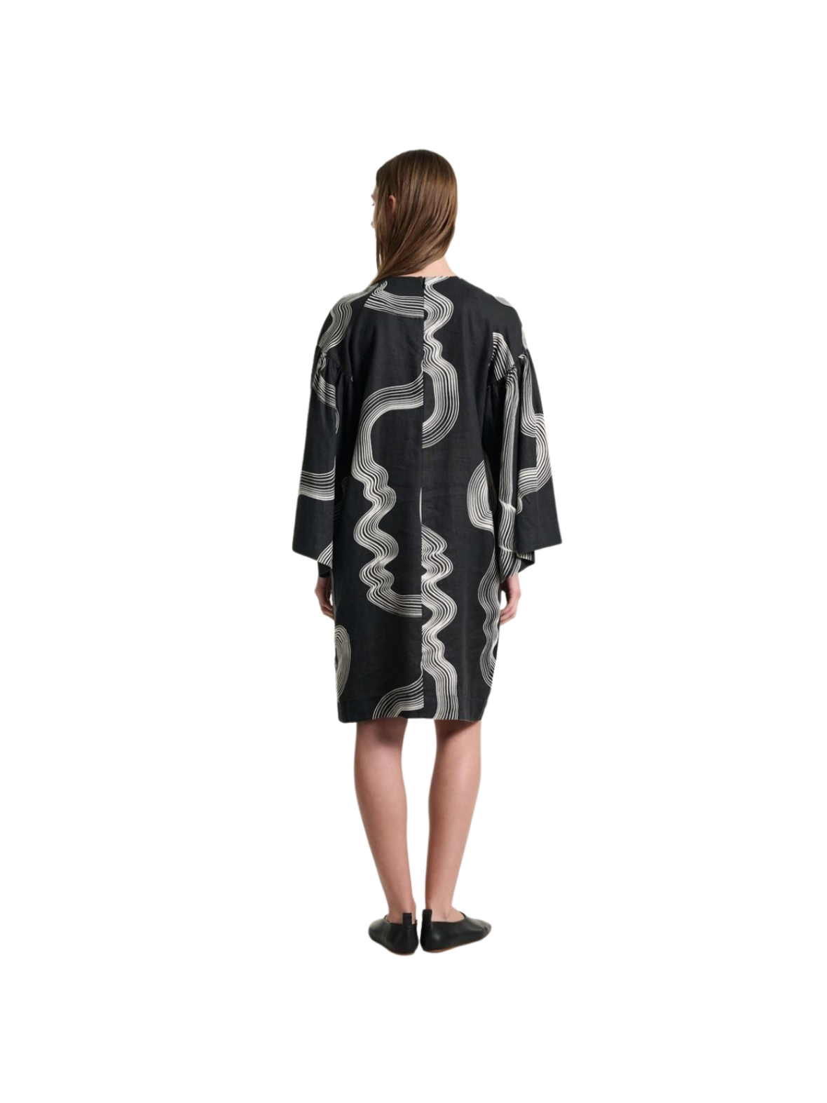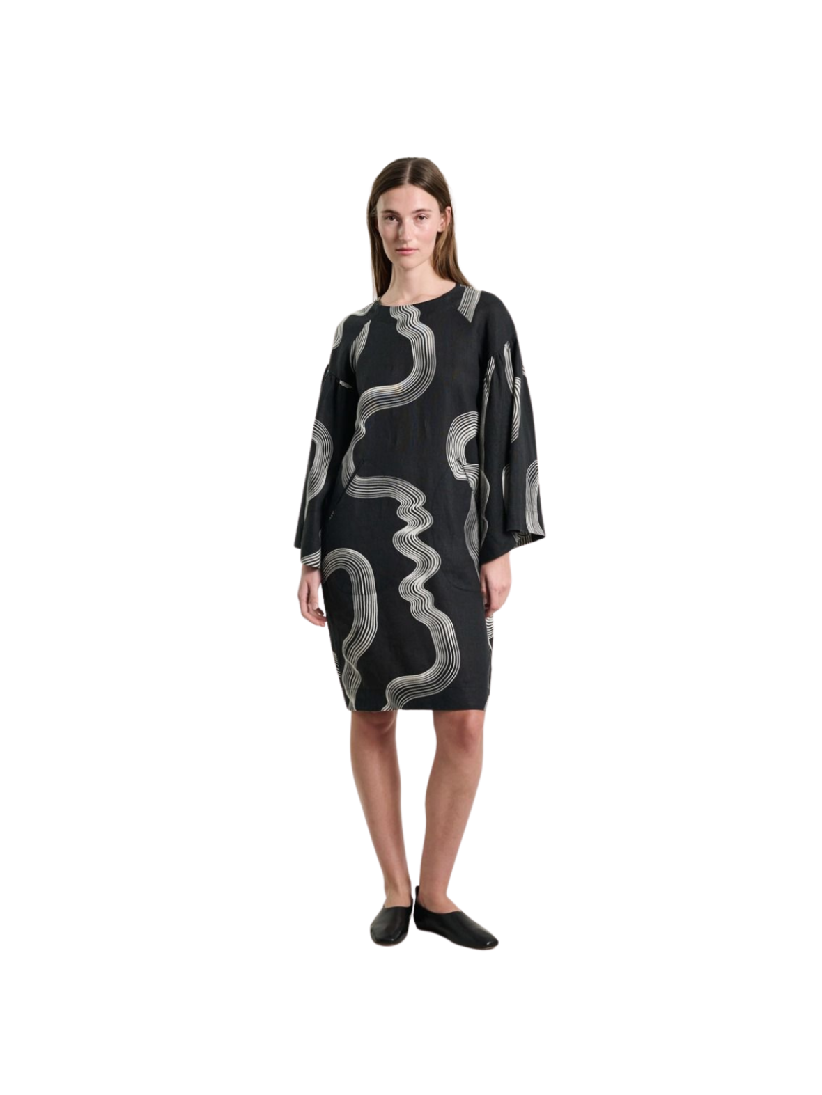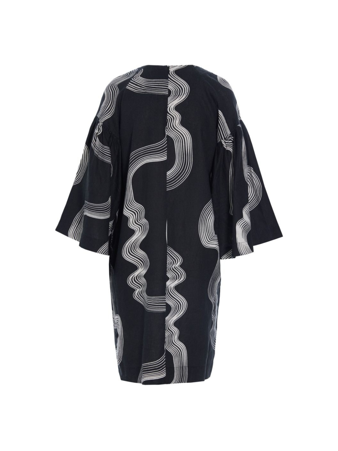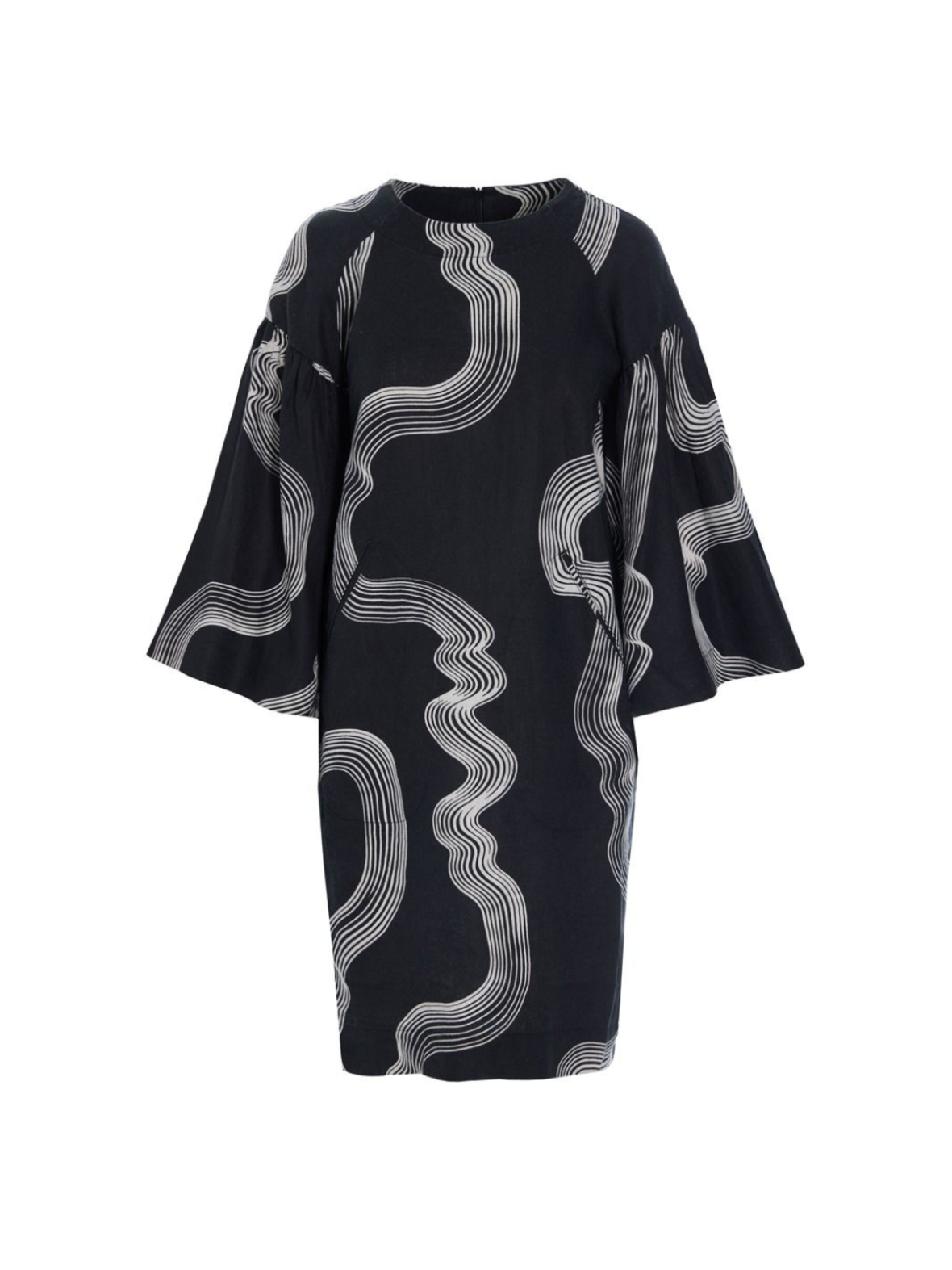 Denne smukke kjole kombinerer et grafisk udtryk med en løs og behagelig pasform. Det mørke design brydes af organiske, bølgende linjer i kontrast, som giver et moderne og kunstnerisk look. Kjolen har rund hals og trekvartlange ærmer med vidde, der skaber et elegant og let fald. Den løse silhuet gør den komfortabel at have på og giver et afslappet, men stilfuldt udtryk. Brug den alene med støvler eller sneakers for et enkelt hverdagslook, eller style den med strømpebukser og accessories for et mere sofistikeret udtryk.