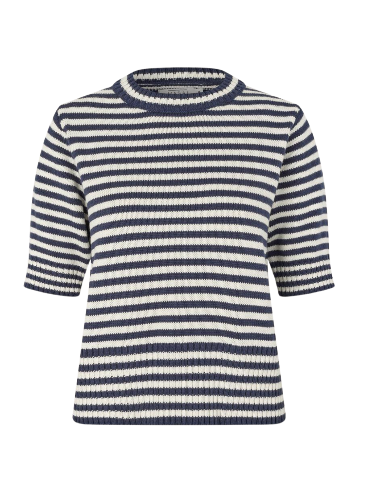 Strikket T-shirt fra Masai i klassiske navy- og cremefarvede striber. Modellen har rund hals, korte ærmer og ribkanter, der giver en flot pasform. En blød og komfortabel style, som nemt kan bruges til både hverdag og pænere anledninger.