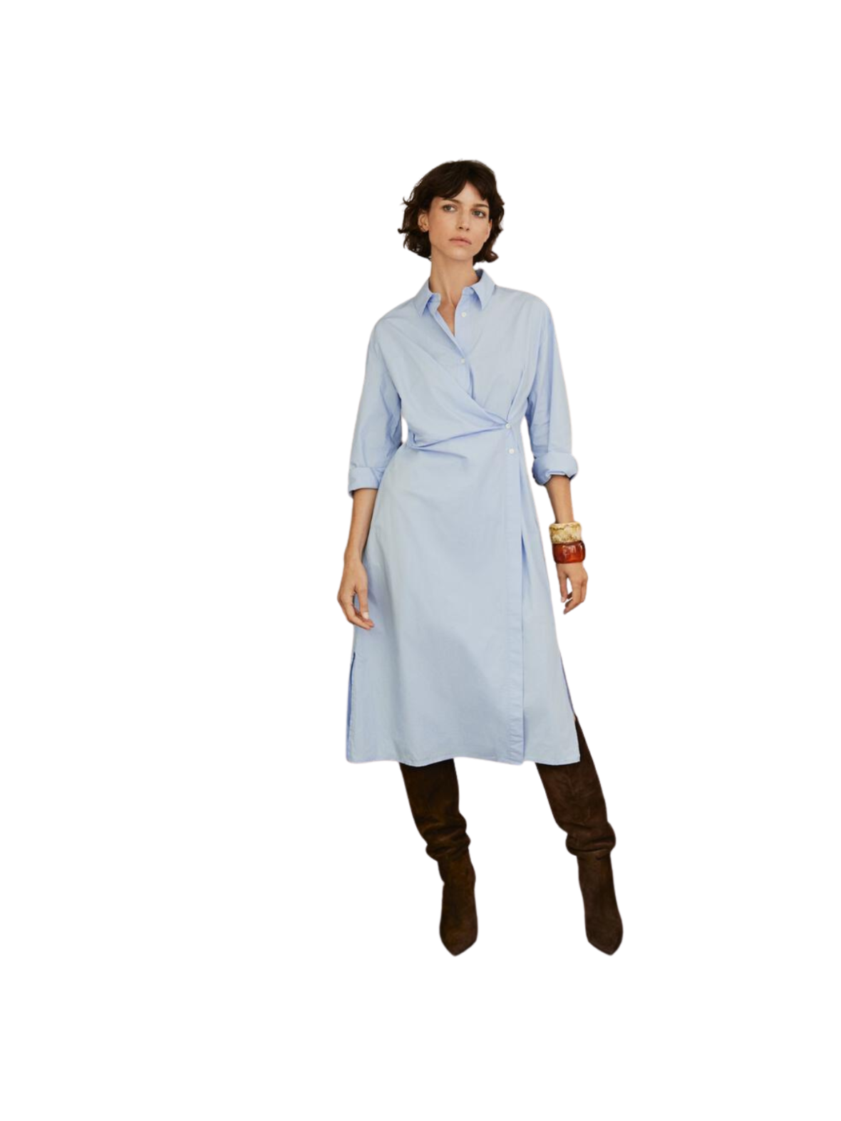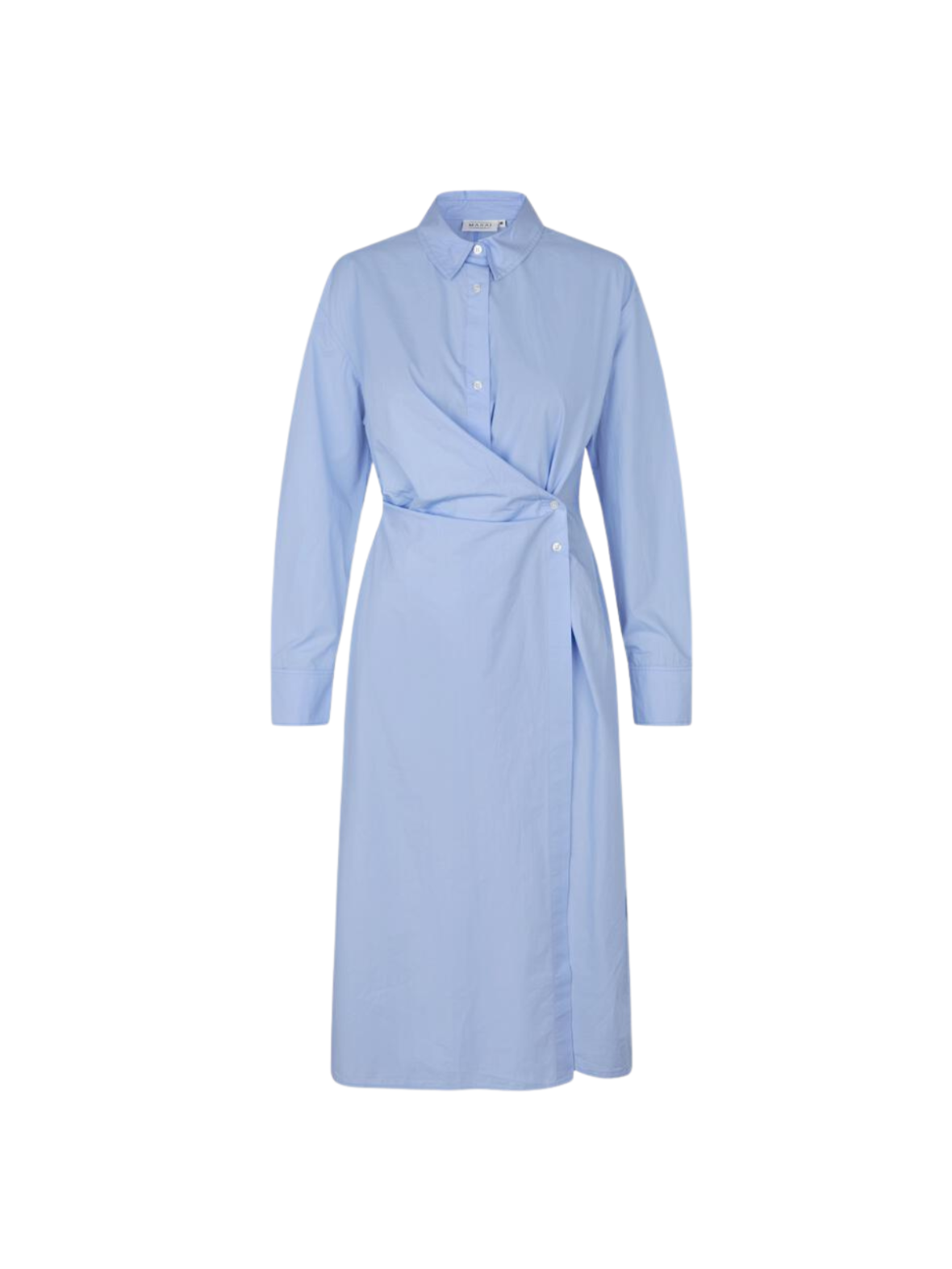 Elegant skjortekjole i en smuk, lys blå nuance med et feminint slå-om design, der smukt fremhæver taljen. Den klassiske krave og de lange ærmer giver et stilrent og sofistikeret udtryk, mens den lette kvalitet sikrer komfort hele dagen. Brug den med sandaler og en enkel taske til et afslappet hverdagslook, eller style den med hæle og smykker for en mere elegant anledning. En tidløs kjole, der kombinerer klassisk tailoring med moderne femininitet.