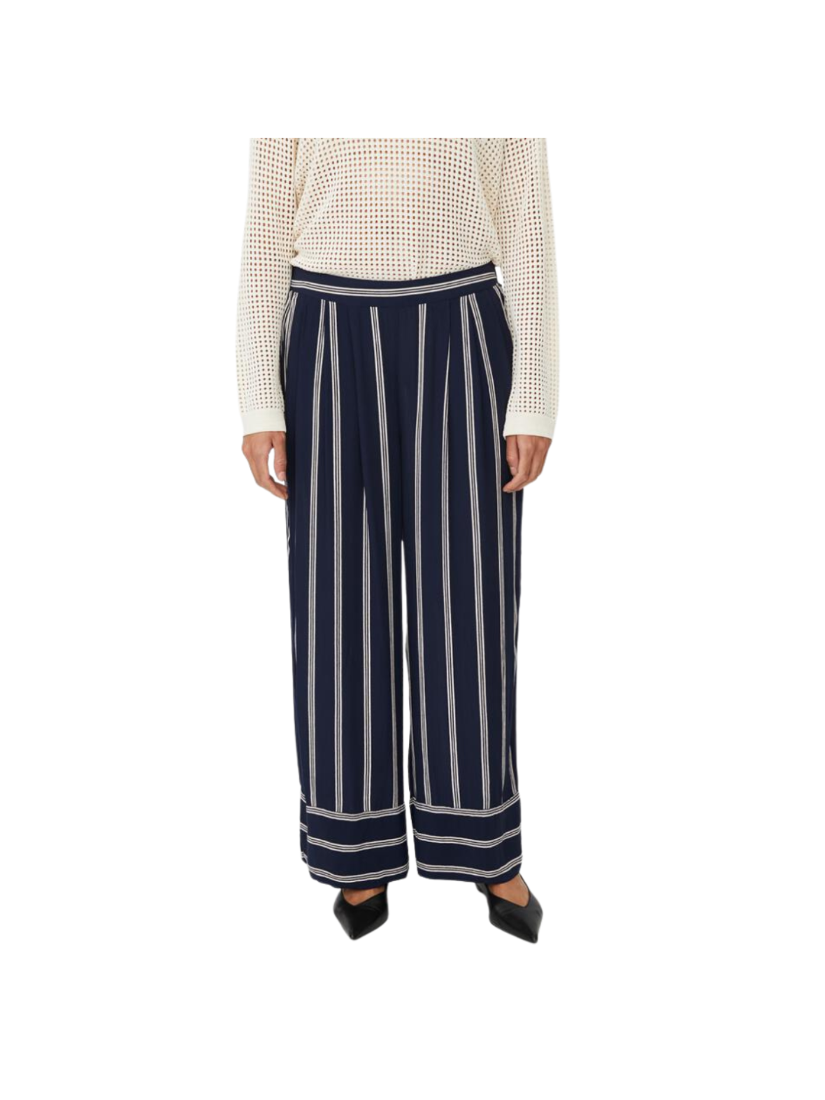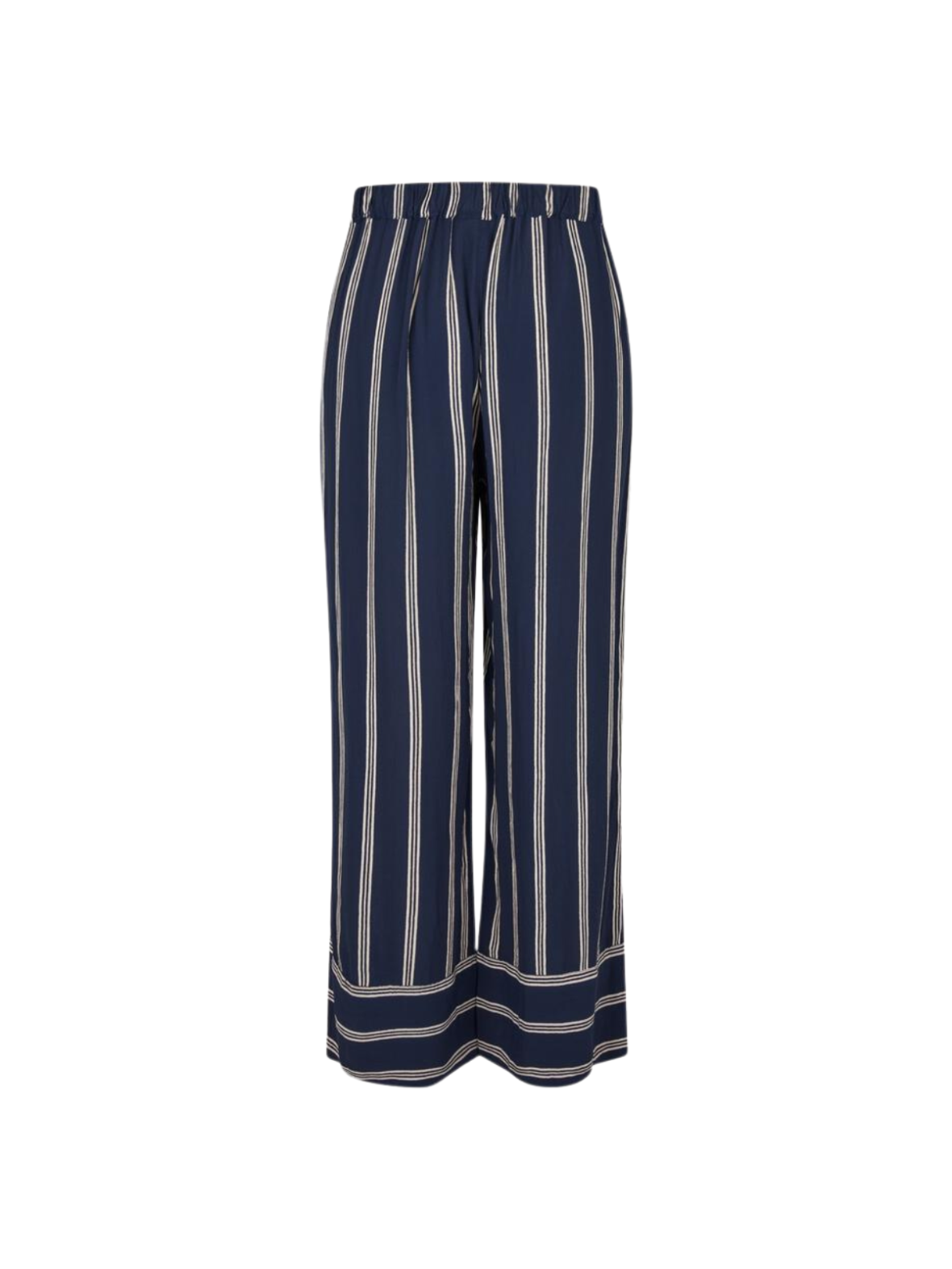 Elegante bukser i en smuk navy nuance med fine, lyse striber der skaber et let og eksklusivt udtryk. Den løse pasform og brede ben giver et feminint fald og en behagelig komfort hele dagen. Style dem med en enkel top og sandaler for et afslappet sommerlook, eller tilsæt en skjorte og blazer for et sofistikeret sæt. Et stilrent valg, der kombinerer klassiske striber med moderne elegance.