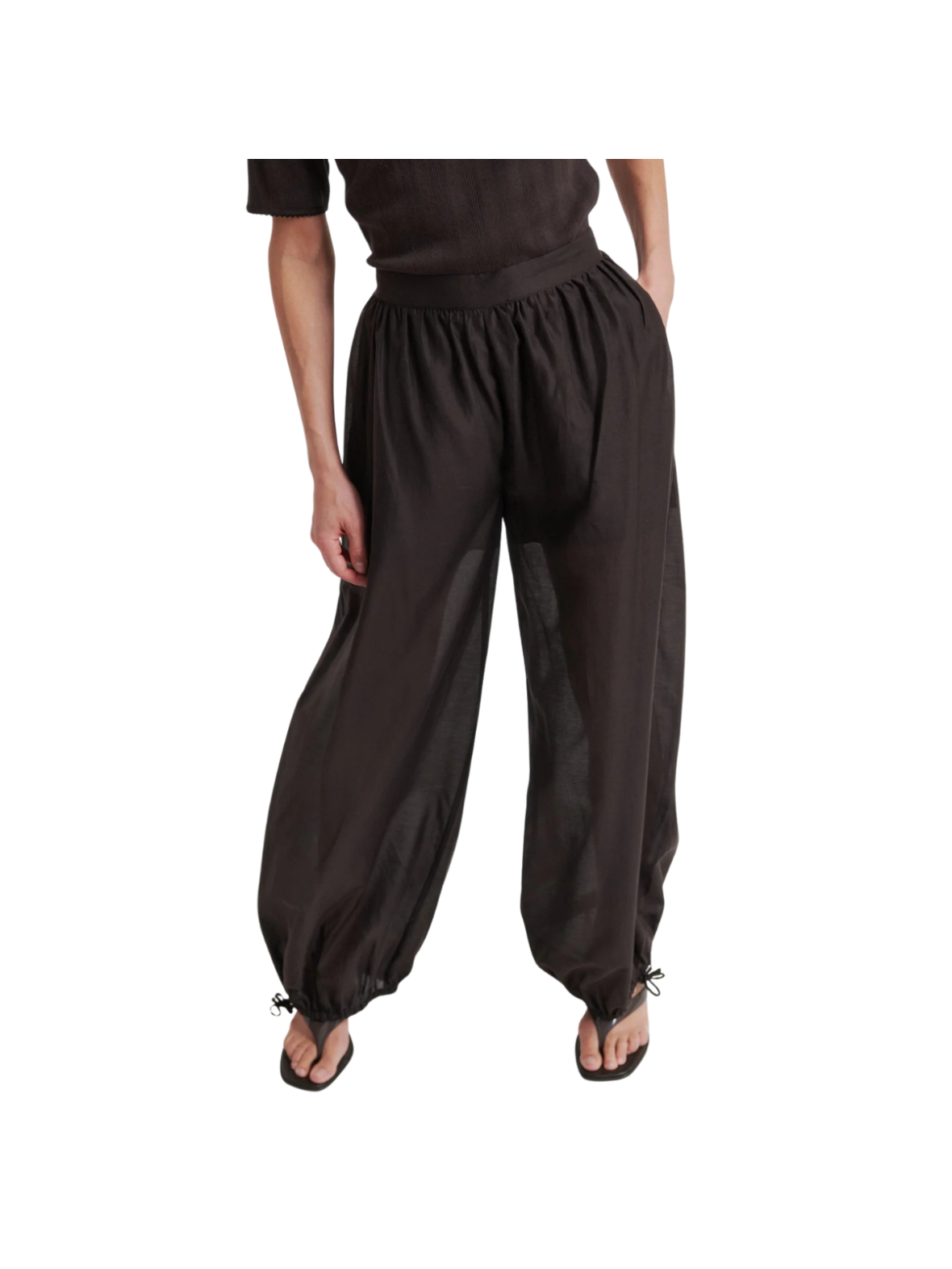 Let og luftige bukser i en dyb brun nuance med et afslappet og moderne udtryk. Den elastiske talje giver en komfortabel pasform, mens den løse silhuet sikrer et flot og bevægeligt fald. De justerbare snøredetaljer ved anklerne tilfører et casual og stilfuldt twist. Perfekte til varme dage og afslappede, stilrene outfits.