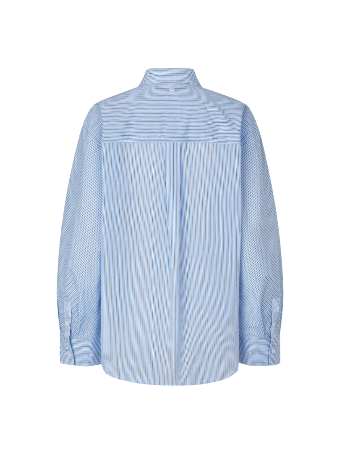Klassisk skjorte i en smuk lyseblå nuance med fine, lodrette striber. Den let løse pasform og de brede manchetter giver et moderne og afslappet udtryk, mens den klassiske krave og knaplukning holder looket tidløst. En alsidig style, der passer perfekt ind i både hverdags- og kontorgarderoben. Style den med habitbukser for et sofistikeret look – eller med jeans og sneakers for en casual, stilren styling.