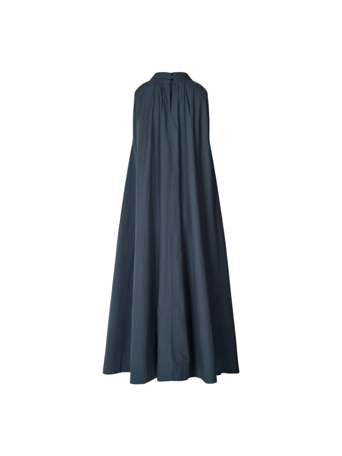 Elegant maxi kjole i en dyb blå nuance med smuk, flydende silhuet. Den høje hals og de fine læg foran giver et sofistikeret og feminint udtryk, mens det lette materiale skaber et elegant fald. Style den med sandaler og enkle smykker til sommerens begivenheder, eller tilsæt hæle og clutch for et mere eksklusivt aftenlook. En tidløs kjole, der udstråler underspillet luksus.