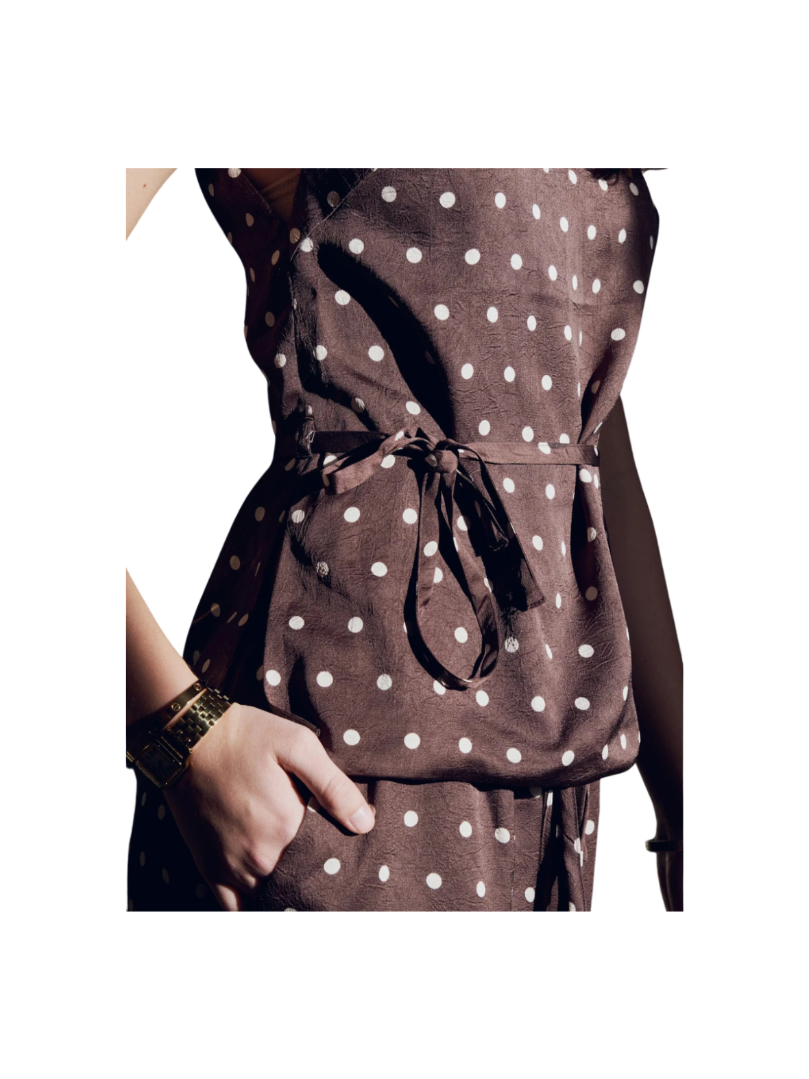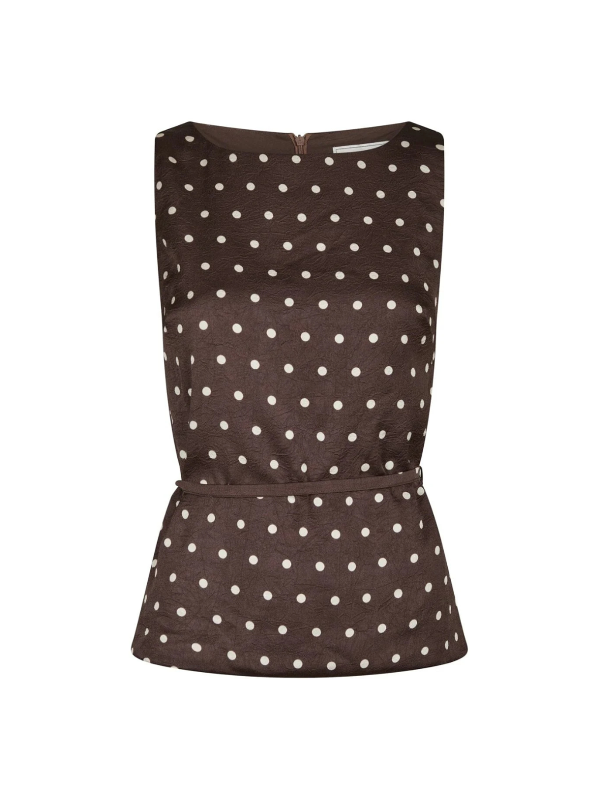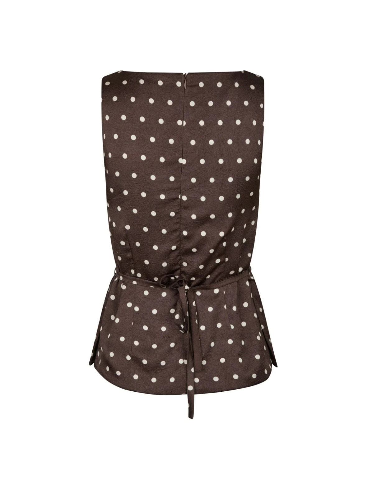 Feminin top i en dyb mørkebrun nuance med klassiske, lyse prikker. Den ærmeløse silhuet og det fine bindebånd i taljen fremhæver figuren og skaber et elegant, flatterende udtryk. Det lette materiale falder smukt og giver et sofistikeret look med et strejf af retro. Style den med matchende nederdel eller bukser for et gennemført sæt – eller med jeans og hæle for en chic og moderne styling.