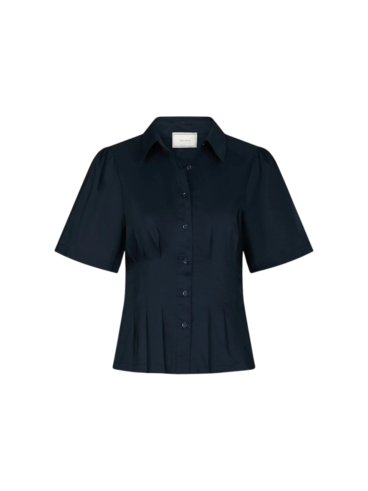 Feminin poplin skjorte i en smuk navy nuance med fine, figurskabende detaljer. Den lette kvalitet og korte ærmer giver et elegant og sommerligt udtryk, mens taljerede syninger fremhæver silhuetten. Style den med jeans for et klassisk hverdagslook eller kombinér med en nederdel for et mere sofistikeret outfit. En tidløs skjorte, der balancerer klassisk design og moderne femininitet.