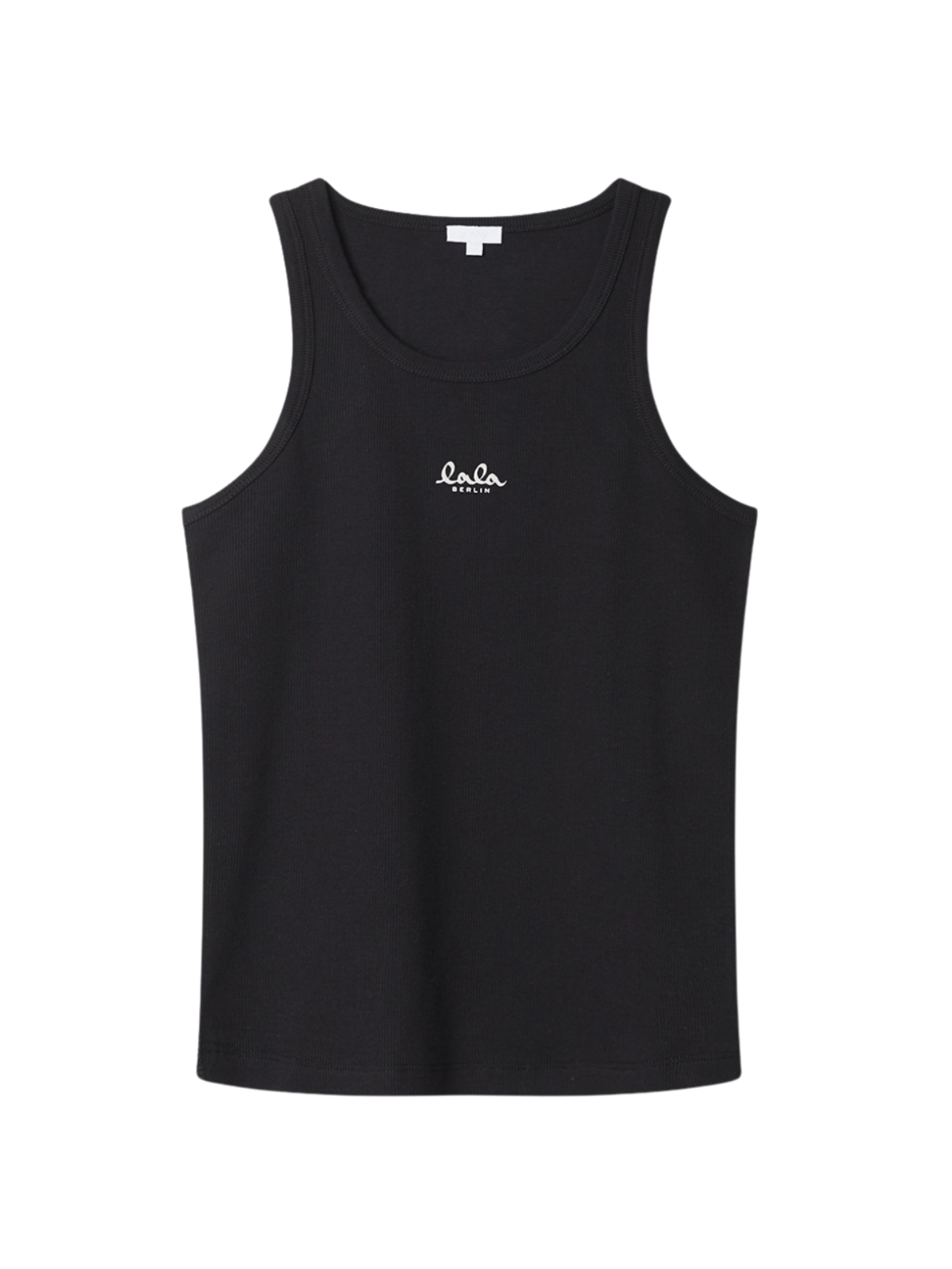 Enkel og stilren ribtanktop i sort med et minimalistisk og moderne udtryk. Den tætsiddende pasform og bløde kvalitet gør den perfekt som både basislag og selvstændig top. Det lille print foran giver et diskret og cool touch. En alsidig top, der passer til både hverdag og afslappede outfits.