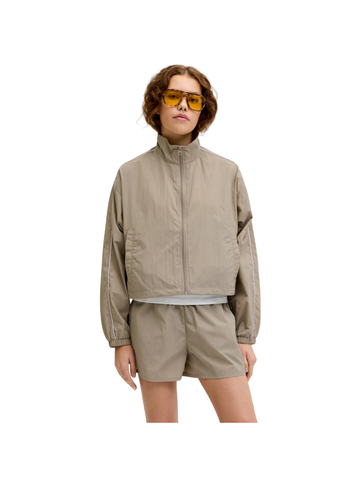 Let og sporty jakke i en beige nuance med et afslappet og moderne udtryk. Lynlåslukningen og de elastiske kanter giver en komfortabel pasform, mens de diskrete stribedetaljer langs ærmerne tilfører et sporty twist. Perfekt som et let lag til både hverdag og fritid. En alsidig jakke, der kombinerer funktionalitet og stil.