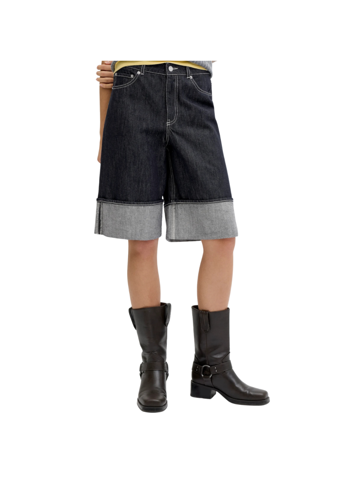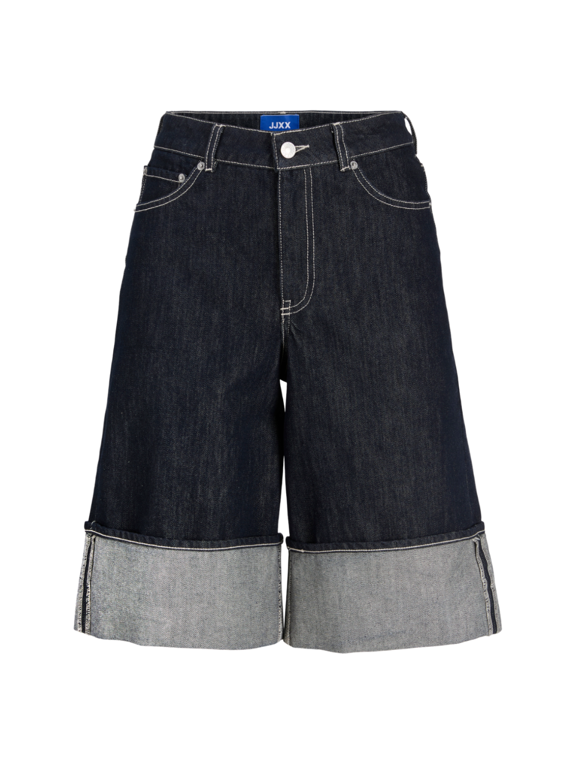 Cool denimshorts i en mørk blå vask med et moderne og afslappet udtryk. Den høje talje og den løse, lange pasform giver en trendy silhuet, mens de brede opsmøgede kanter tilfører et råt twist. Et stilrent design, der nemt kan styles til hverdagsbrug. Style dem med en T-shirt og sneakers for et casual look – eller med en skjorte og sandaler for en mere gennemført og sommerlig styling.