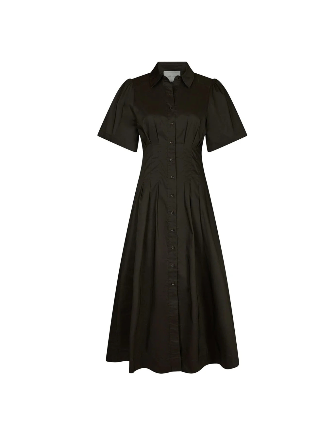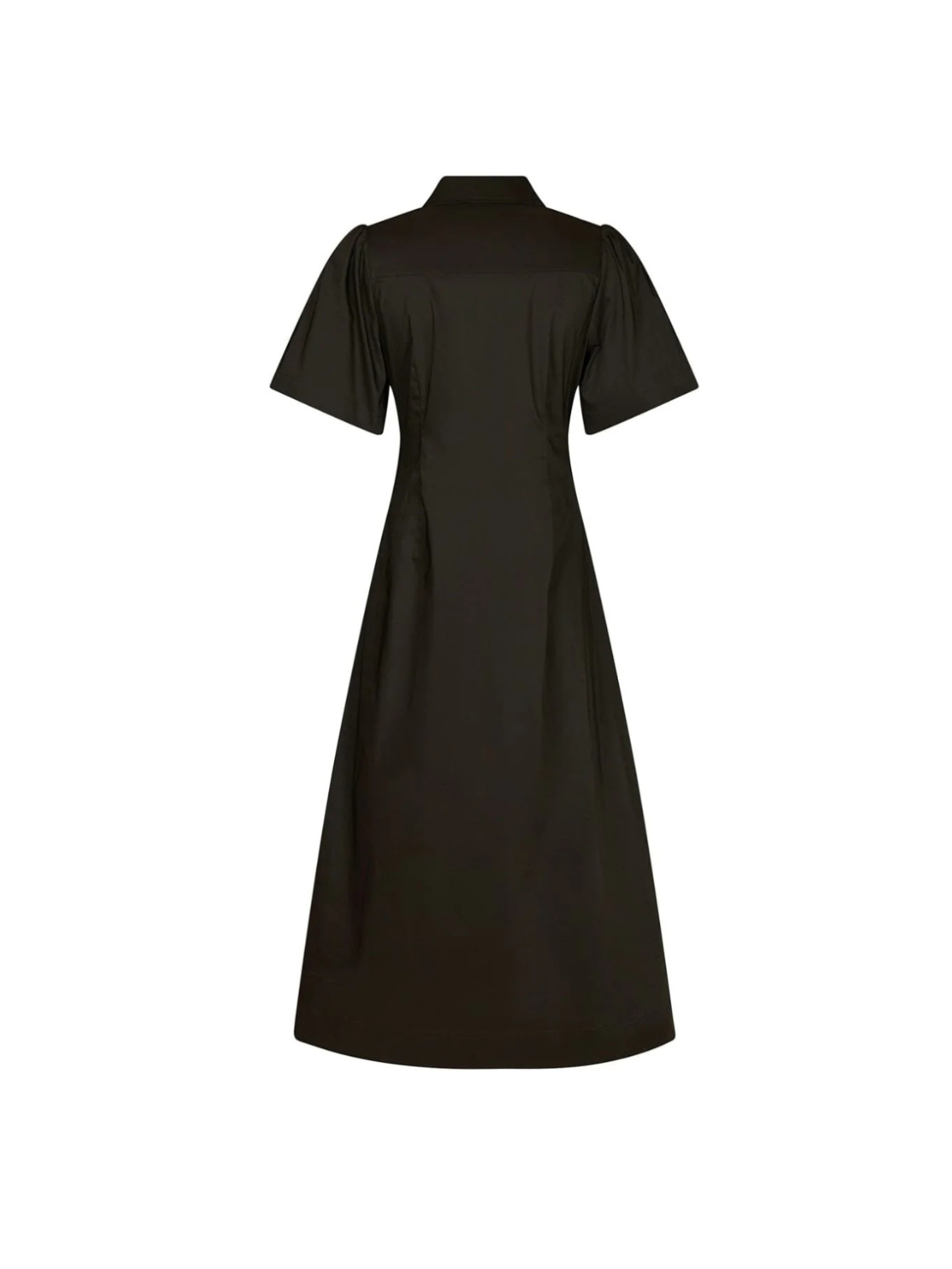 Elegant skjortekjole i sort med et feminint og tidløst udtryk. Designet med klassisk krave, gennemgående knaplukning og korte ærmer, der giver et stilrent look. Den markerede talje og let vidde i skørtet skaber en smuk, flatterende silhuet. Perfekt til både hverdag og mere formelle anledninger.