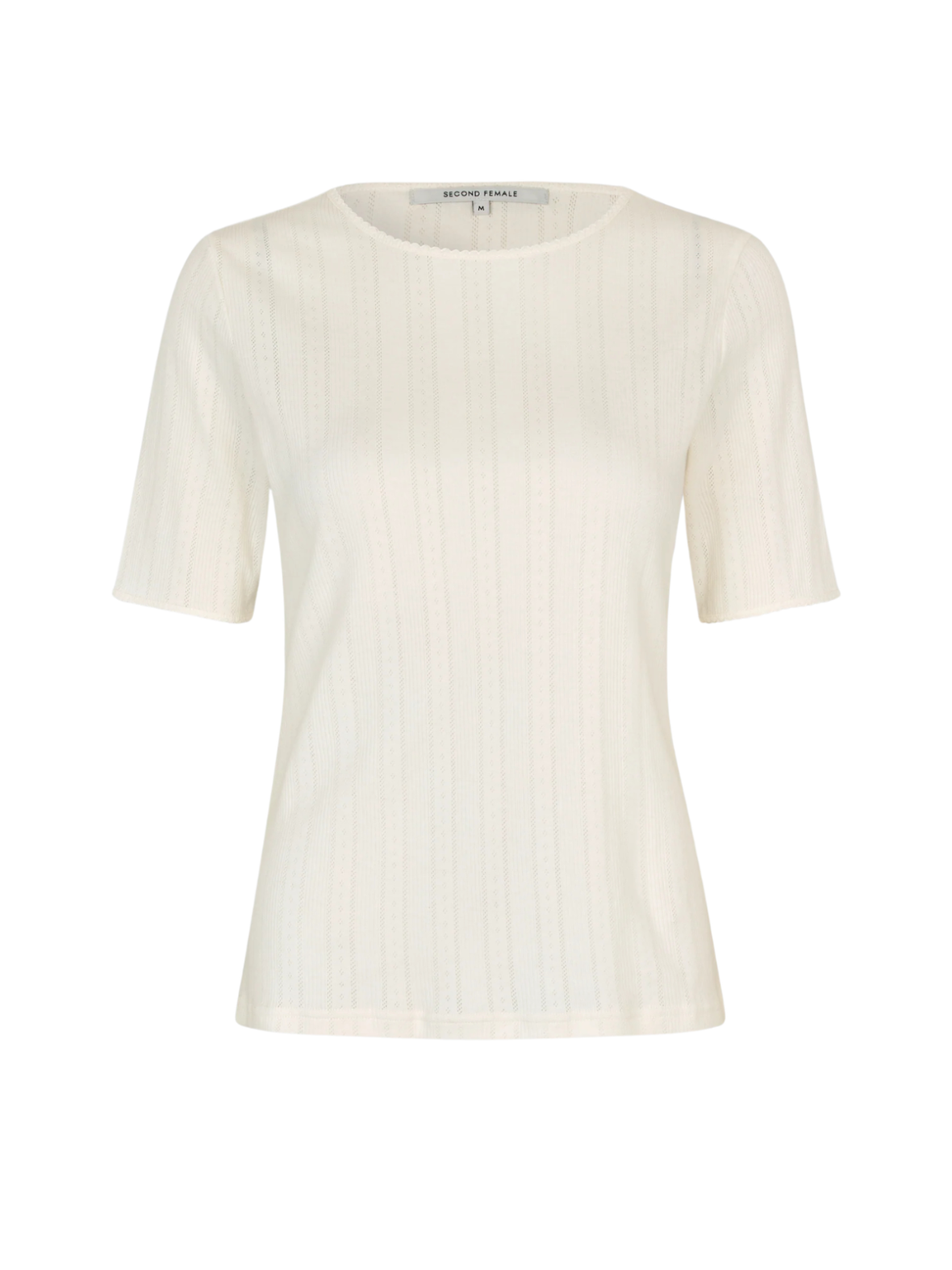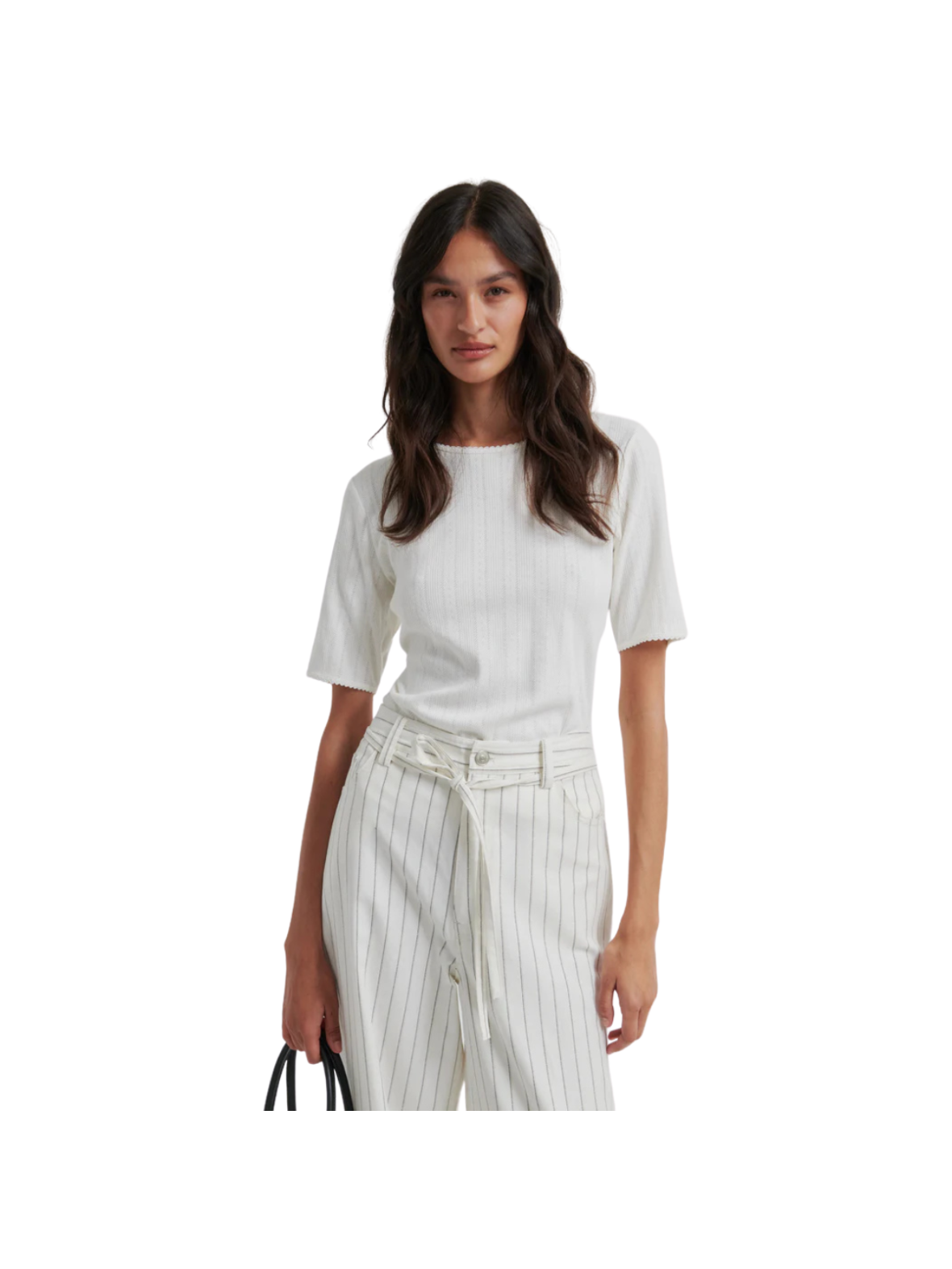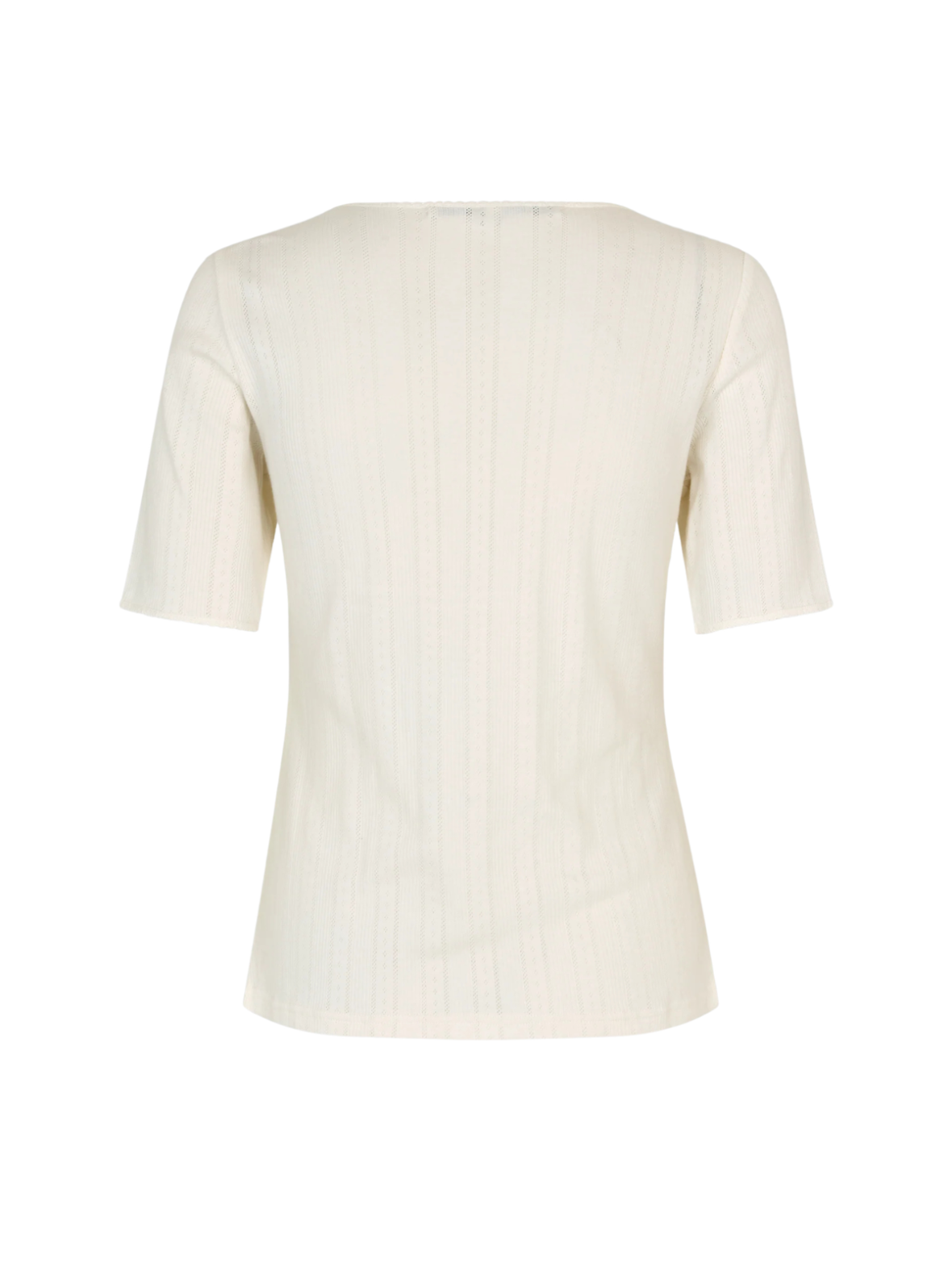 Enkel og feminin T-shirt i en smuk cremefarvet nuance med fin, let transparent ribstruktur. Den tætsiddende pasform og de korte ærmer giver et elegant og minimalistisk udtryk, mens de små bølgedetaljer ved hals og ærmer tilfører et diskret, feminint touch. En perfekt basisstyle, der nemt kan styles til enhver lejlighed. Brug den med jeans for et afslappet look – eller med habitbukser og blazer for en mere sofistikeret styling.